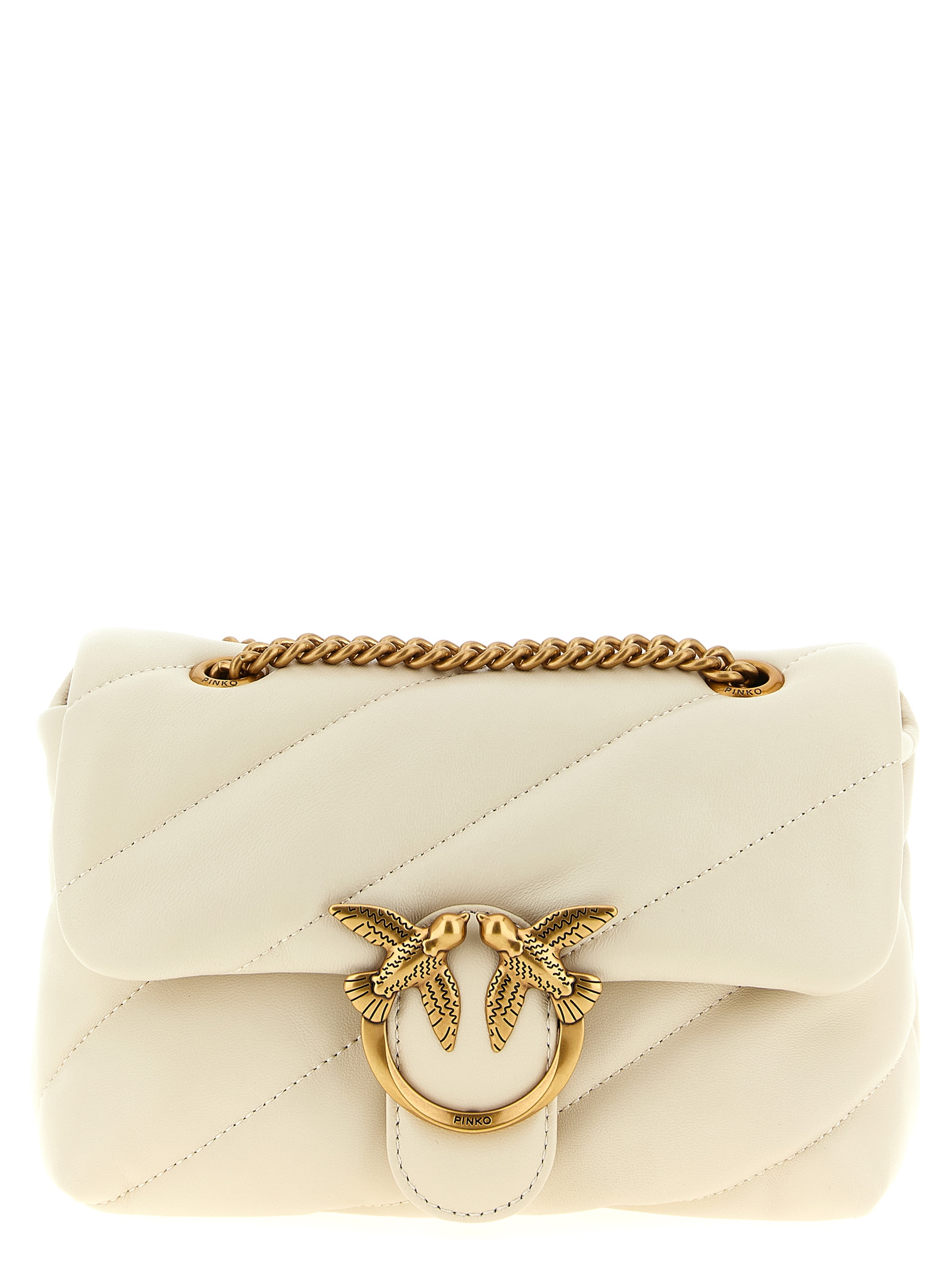 'Mini Love Puff' crossbody bag in nappa leather with large diagonal quilting, magnetic flap closure with iconic ‘Love Birds Diamond Cut’ metal buckle, suede microfiber lining, sliding chain shoulder strap with nappa leather shoulder pad.