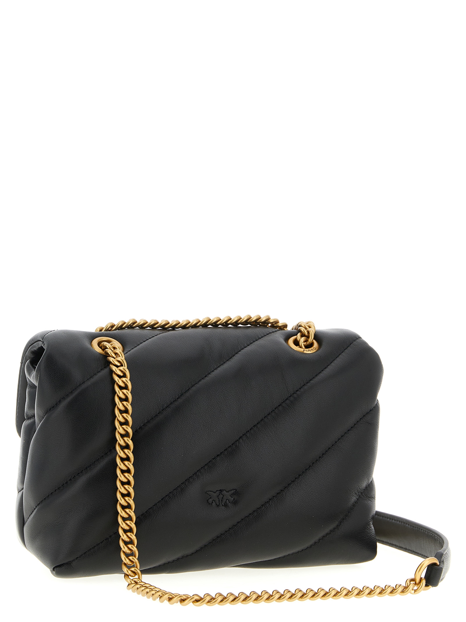'Mini Love Puff' crossbody bag in nappa leather with large diagonal quilting, magnetic flap closure with iconic ‘Love Birds Diamond Cut’ metal buckle, suede microfiber lining, sliding chain shoulder strap with nappa leather shoulder pad.