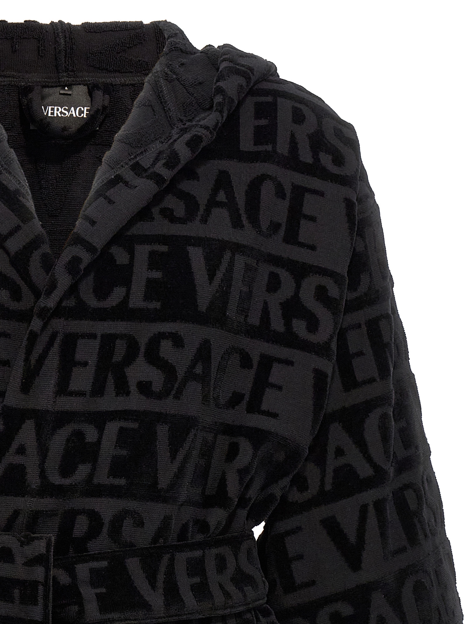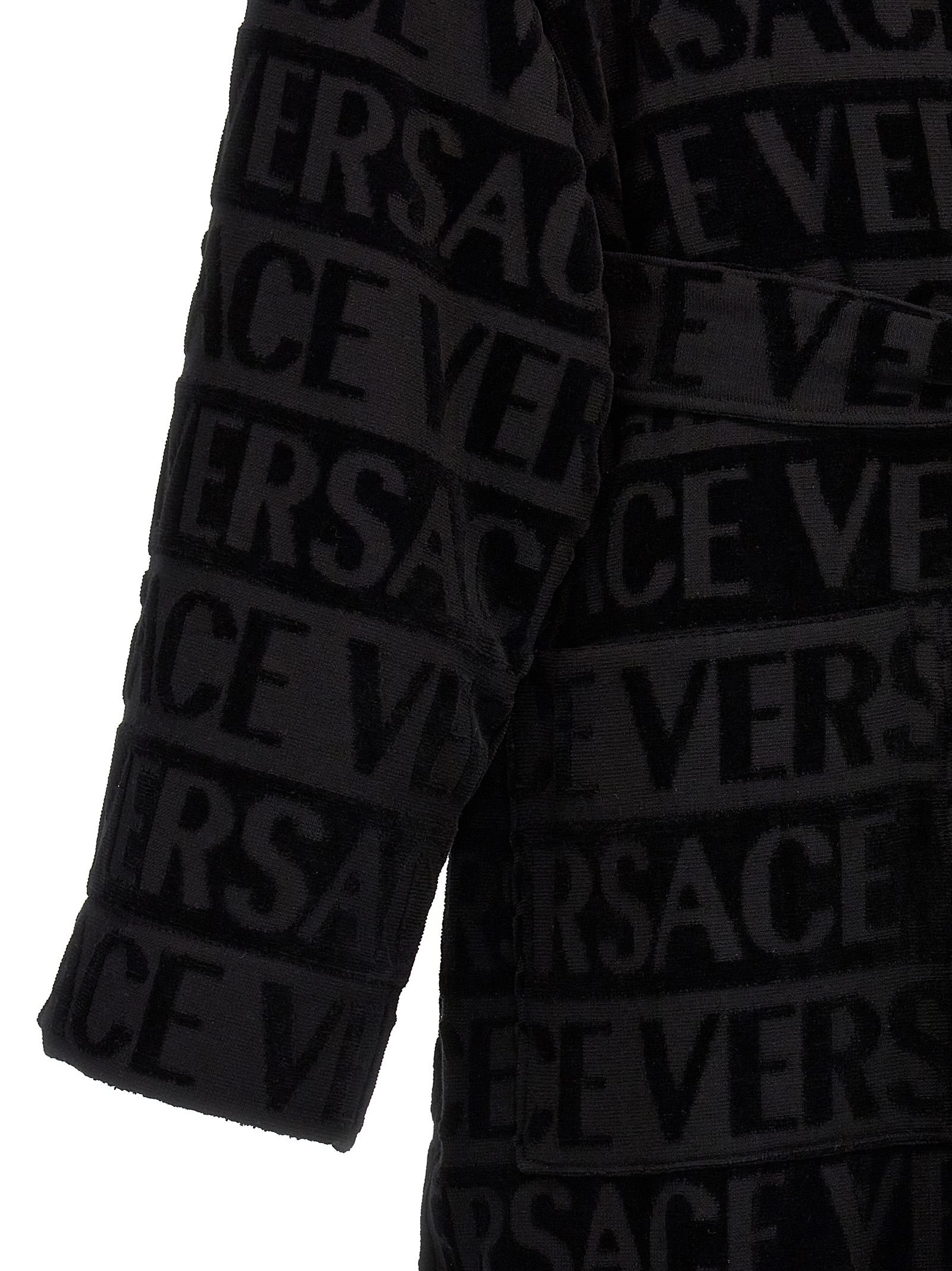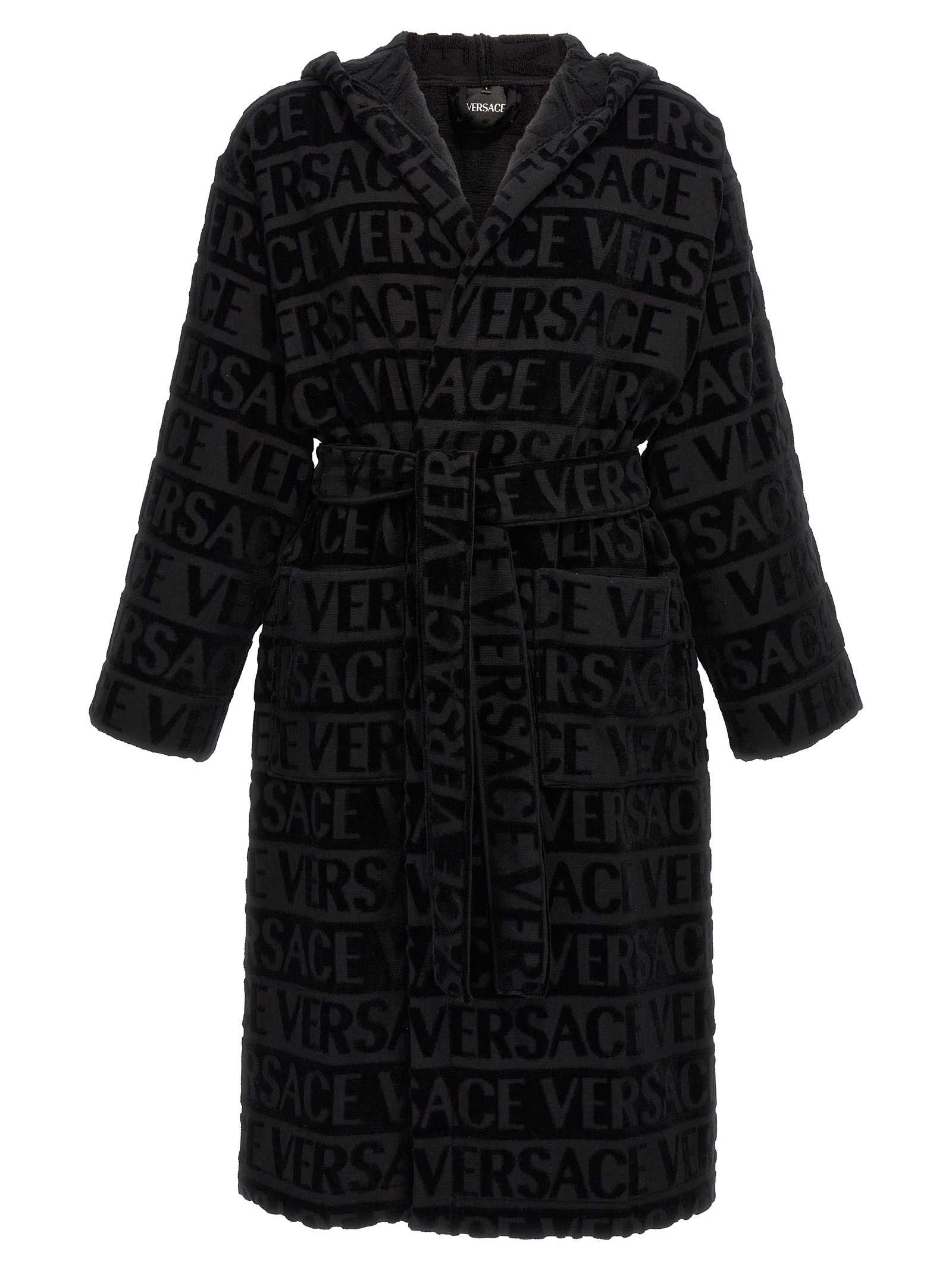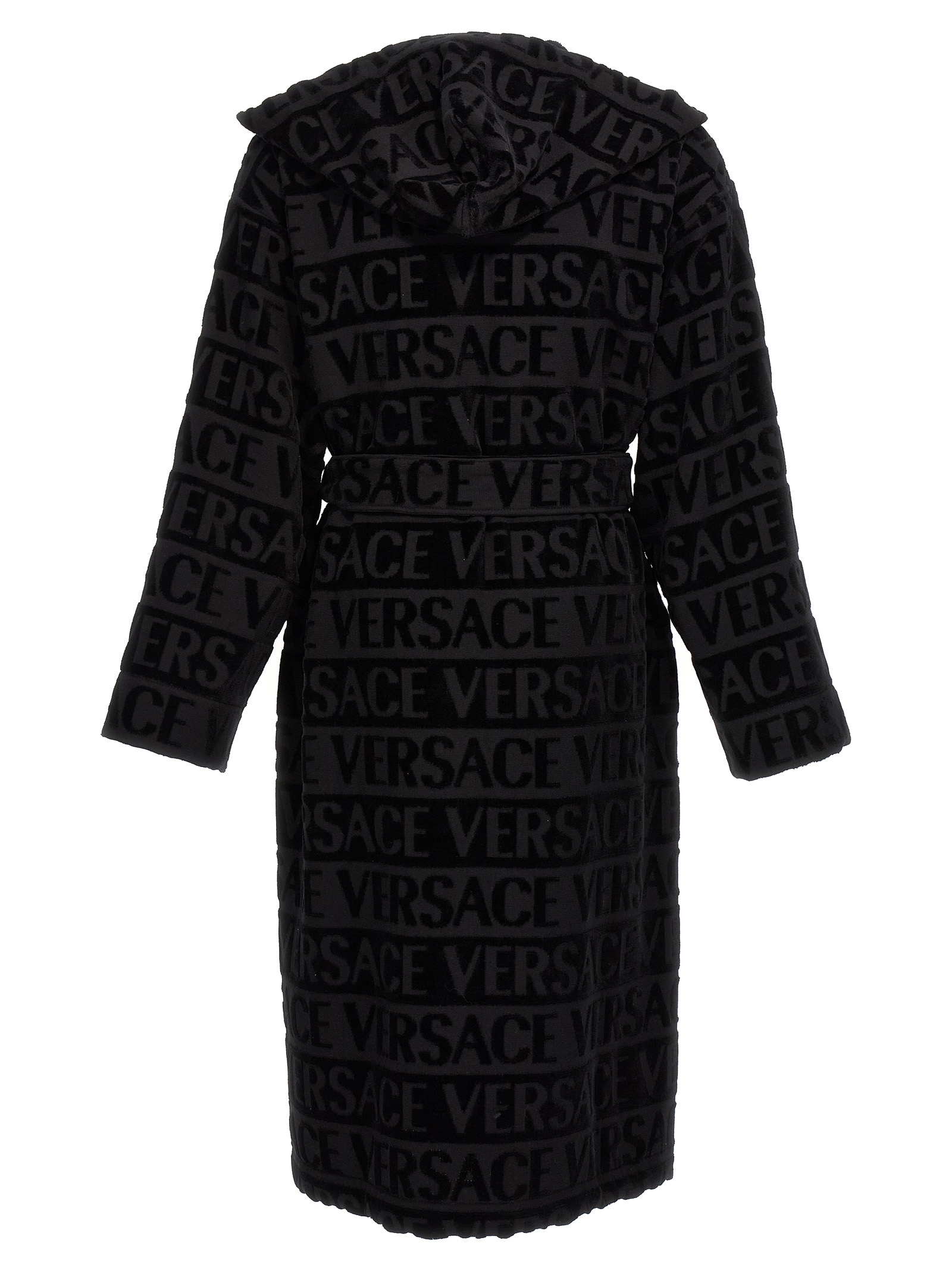 Cotton terry bathrobe with jacquard 'Versace Allover' pattern, hood, pockets and belt at the waist.