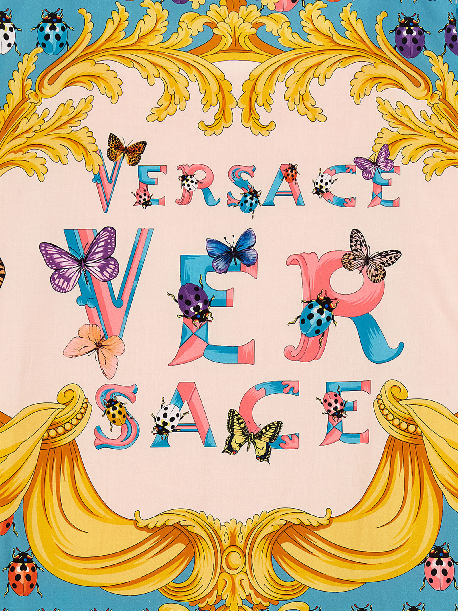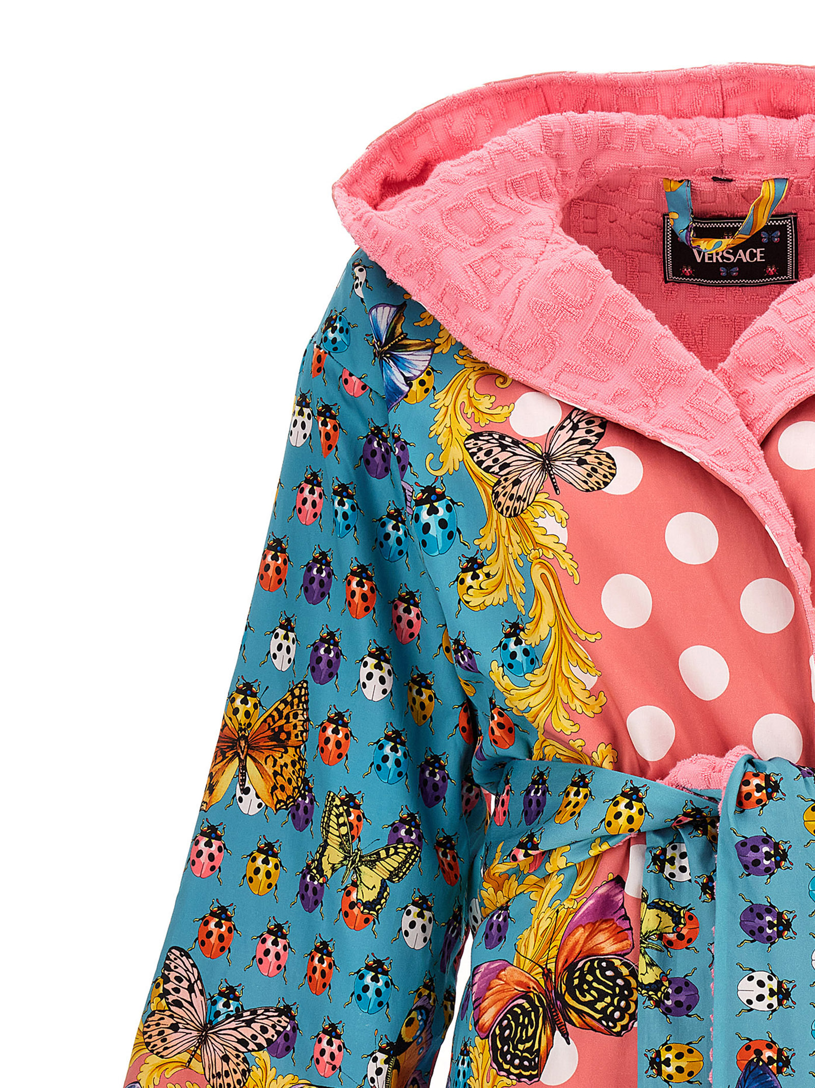 La Vacanza short cotton terry cloth capsule bathrobe with 'Heritage Butterflies & Ladybugs' print, 'Versace Allover' pattern on the inside, features a hood, pockets and a belt at the waist.