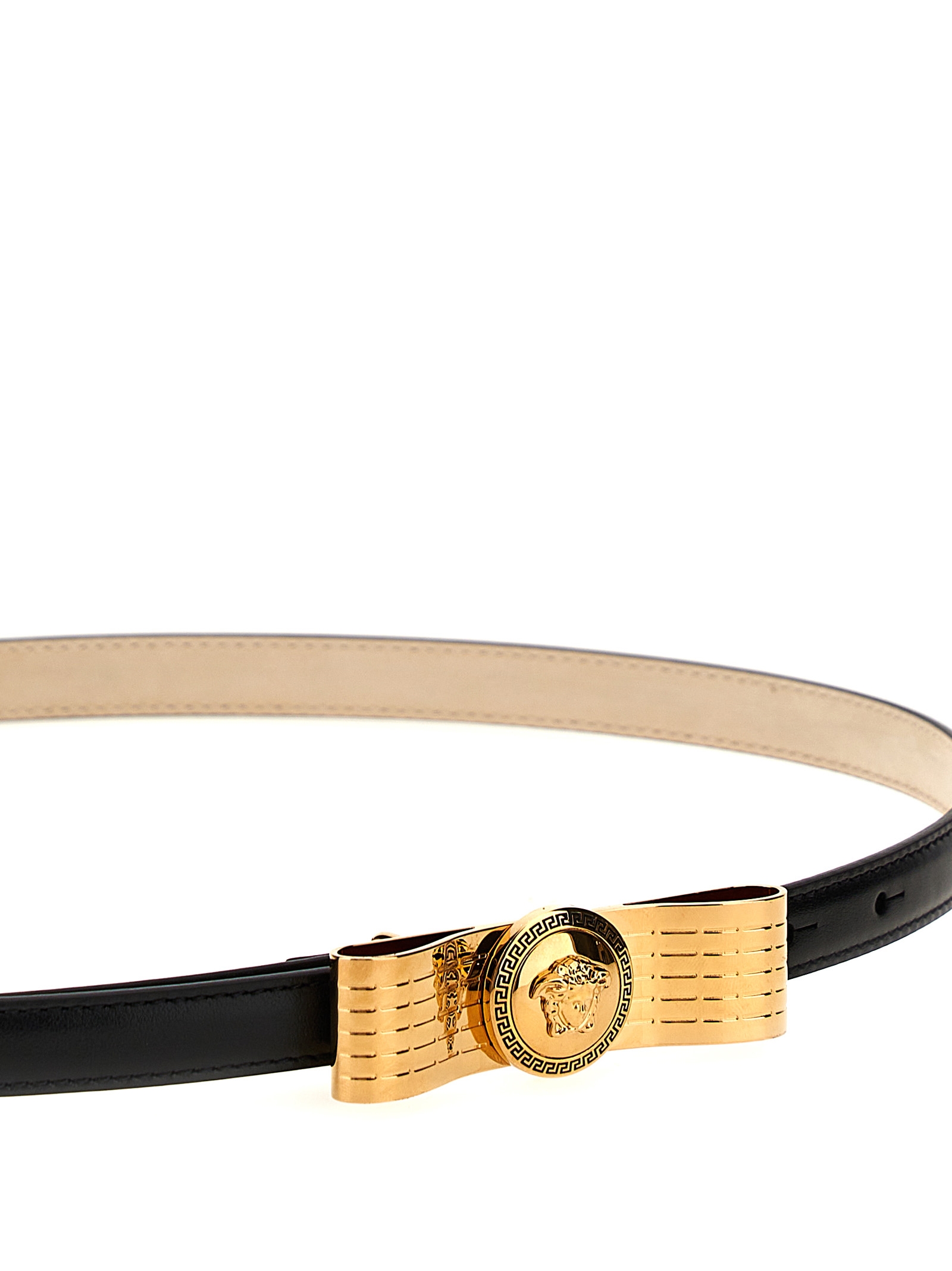 Leather belt with metal bow and 'Medusa' logo.