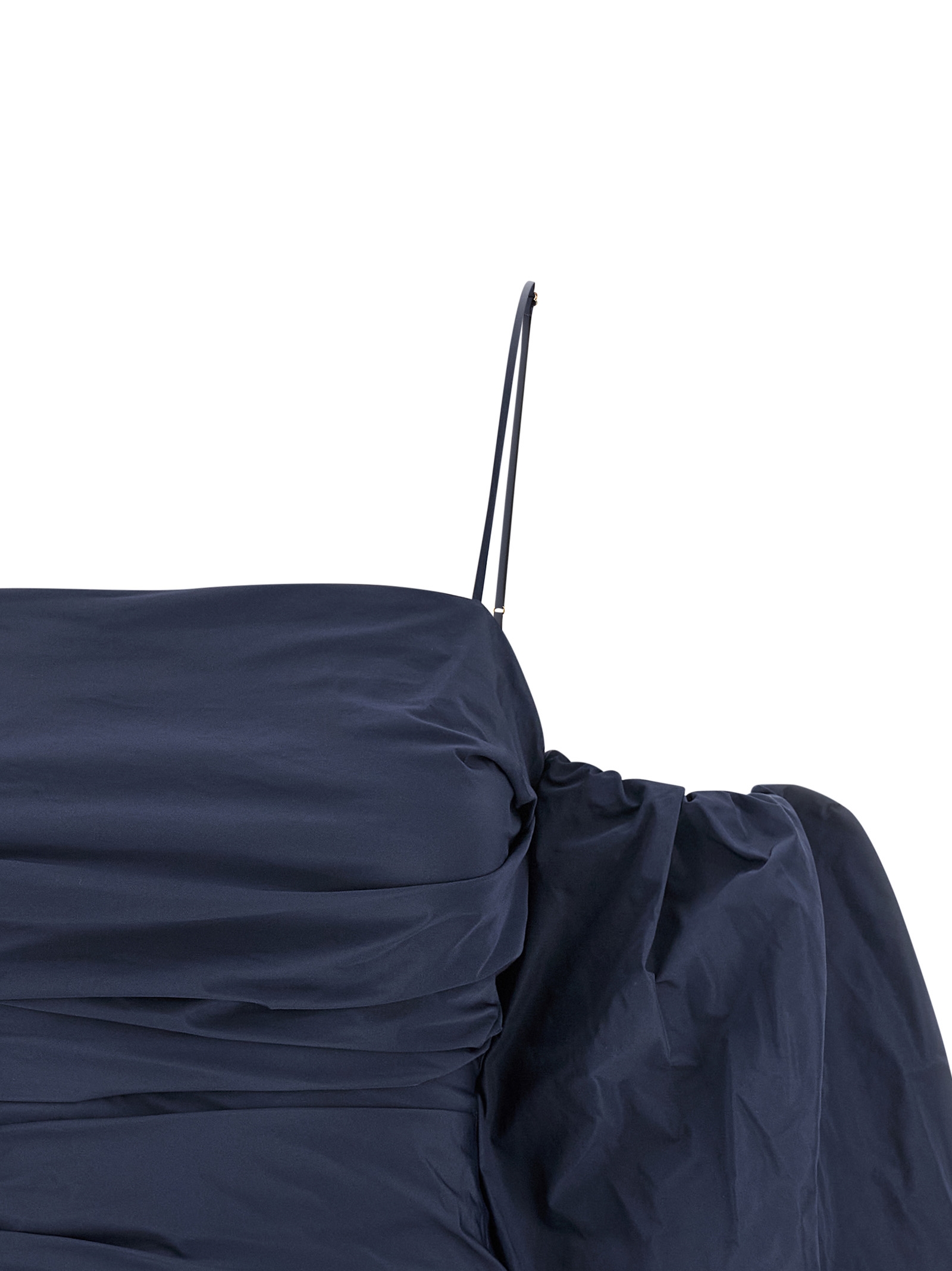 'Pallottoliere' bustier top in slightly ruffled taffeta with back hook closure and front and back pleats, thin adjustable straps, removable balloon sleeves with elastic cuffs.