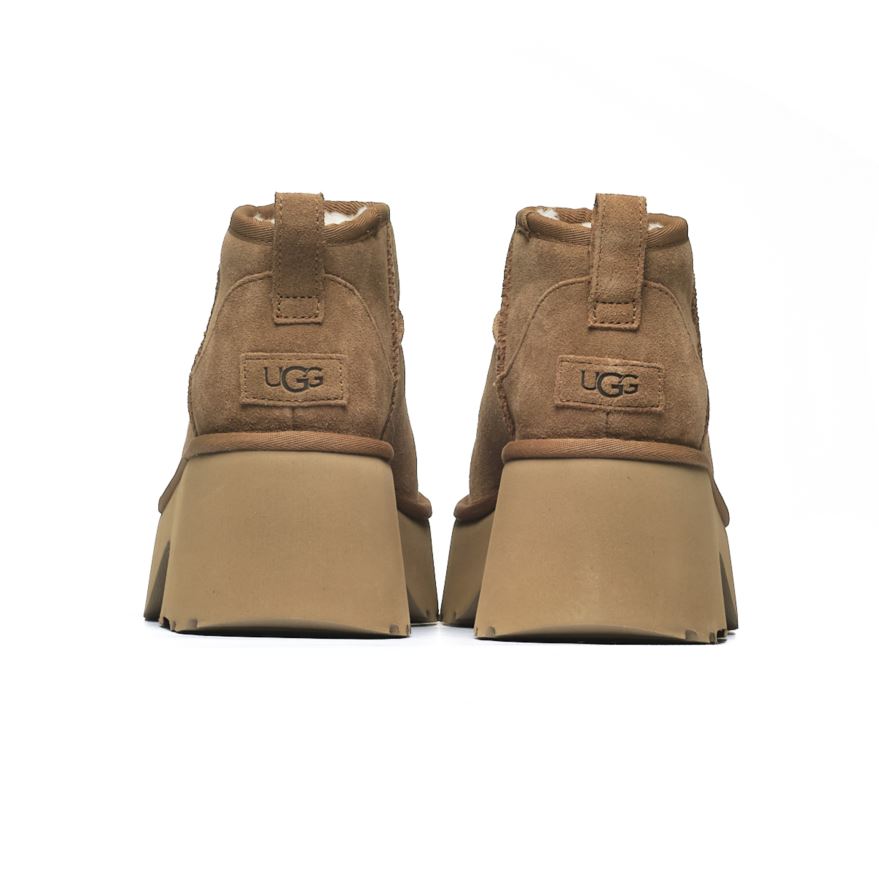 Model Classic Ultra Mini New Heights to odświeżona wersja bestsellerowego botka UGG, wyniesiona na nowy poziom — dosłownie. Wyposażony w platformową podeszwę o wysokości niemal 3 cali, zapewnia modny wygląd i dodatkowe centymetry. Zamszowa cholewka, miękka wyściółka UGGplush™ oraz elastyczna podeszwa Sugarcane EVA gwarantują komfort i styl na co dzień.