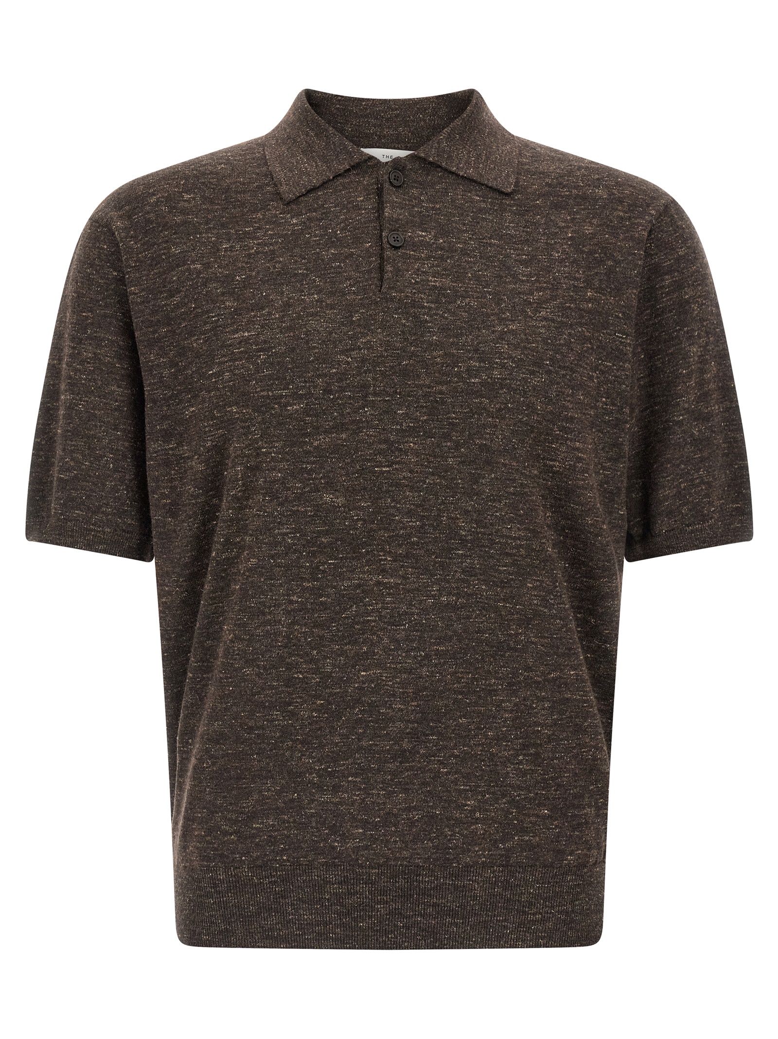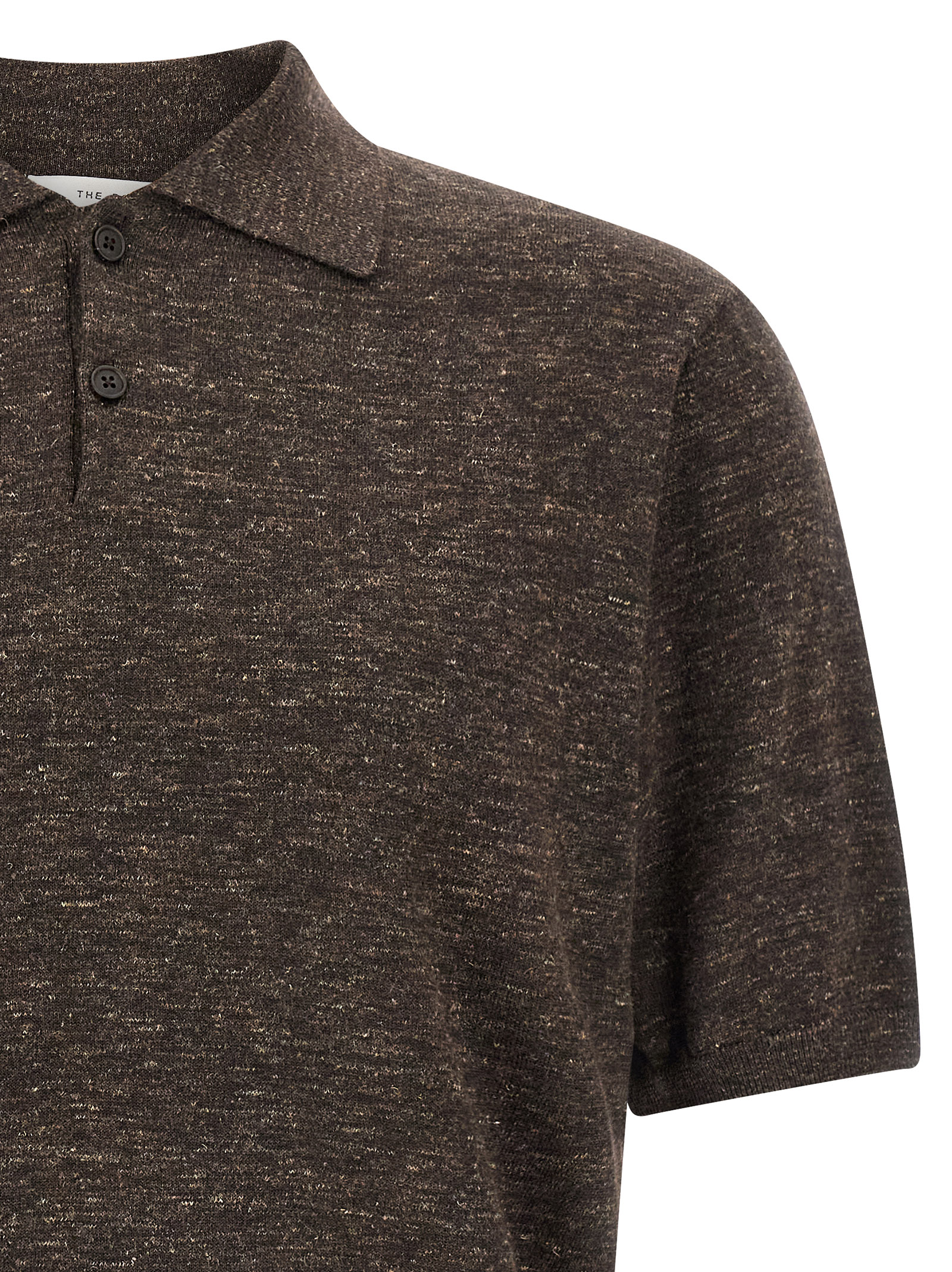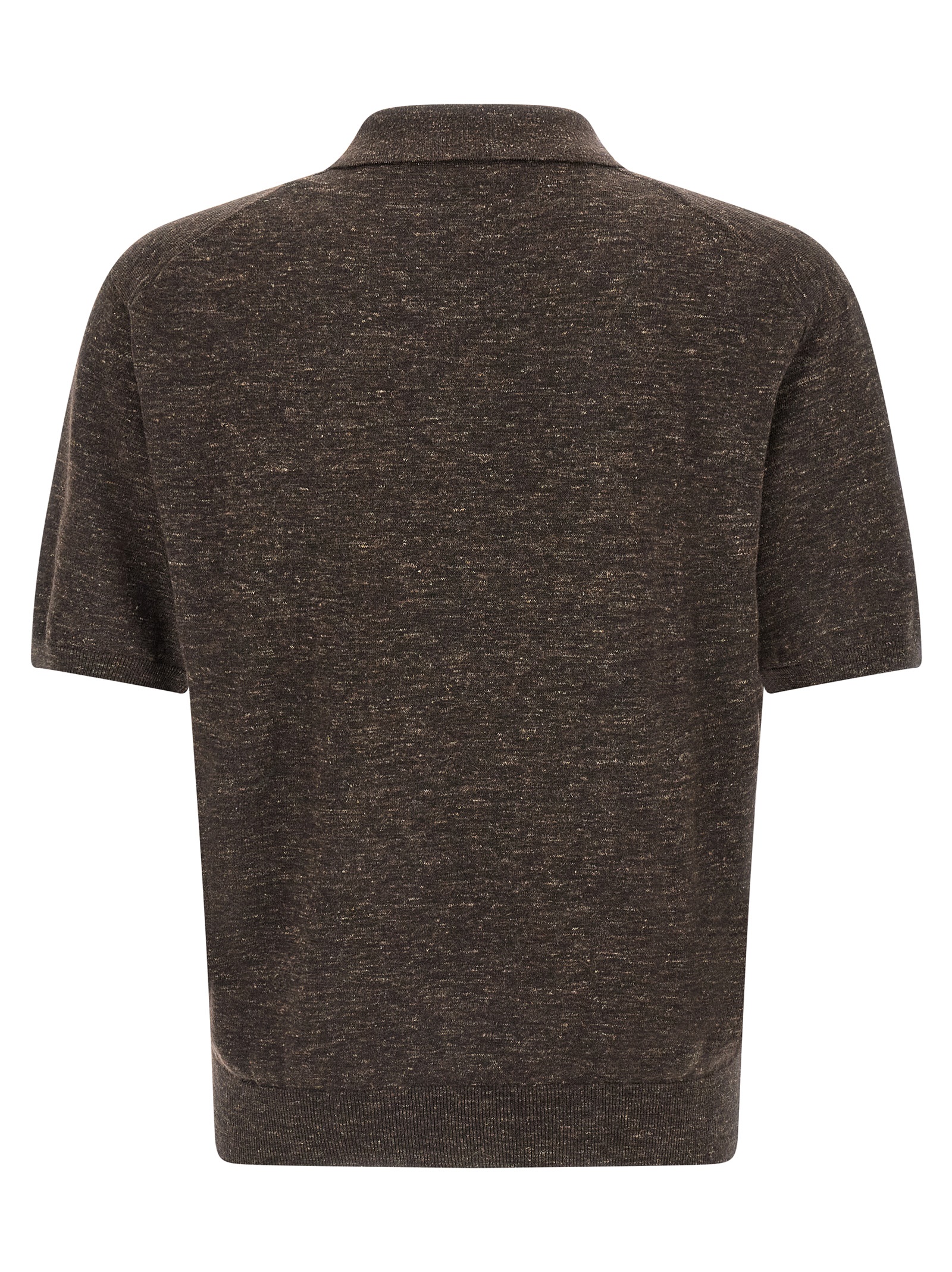 'Borges top' melange knitted sweater mixed with linen and silk, shirt collar, front closure with 2 horn buttons, short sleeves with ribbed hem and cuffs.