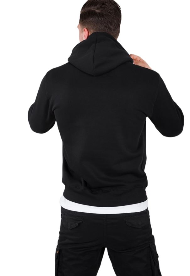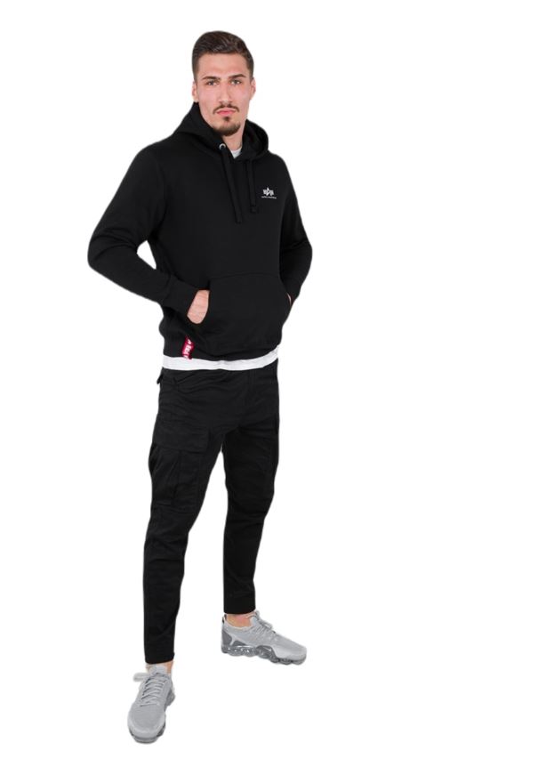 Bluza z kapturem Alpha Industries Basic Hoody Small Logo w kolorze czarnym. Na piersi umieszczono małe logo Alpha Industries. Na dole czerwona taśma Remove before flight.