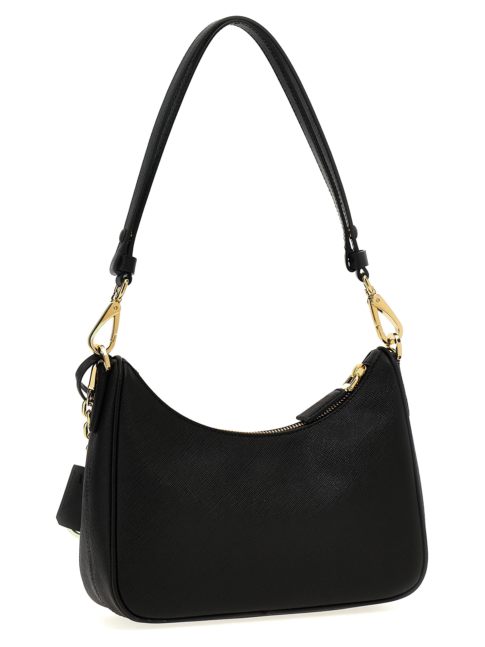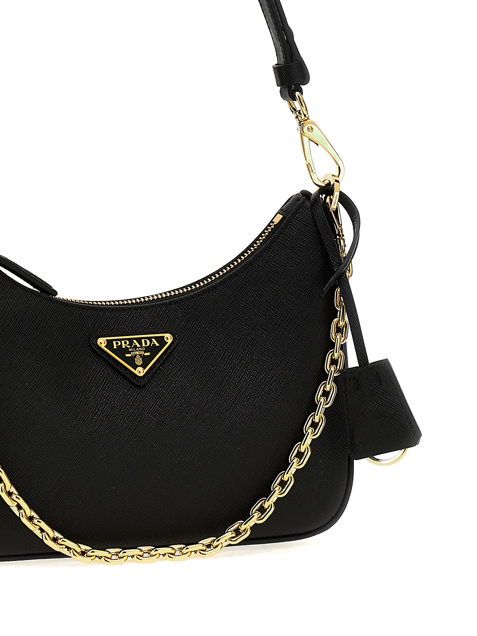 'Prada Re-Edition' mini handbag in Saffiano leather with front enameled metal triangle logo appliqué, zip closure, removable chain handle, adjustable and removable leather keyring.