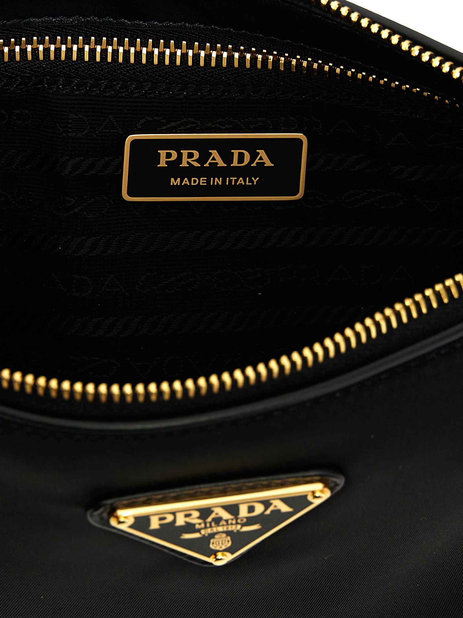 Small shoulder bag in Re-Nylon and smooth leather, front enameled metal triangle logo, zip closure, front metal padlock detail, adjustable shoulder strap in logoed fabric. SUSTAINABLE: This product is made with Re-Nylon, a regenerated yarn made from recycled and purified plastic collected in oceans, fishery nets and textile fibers.