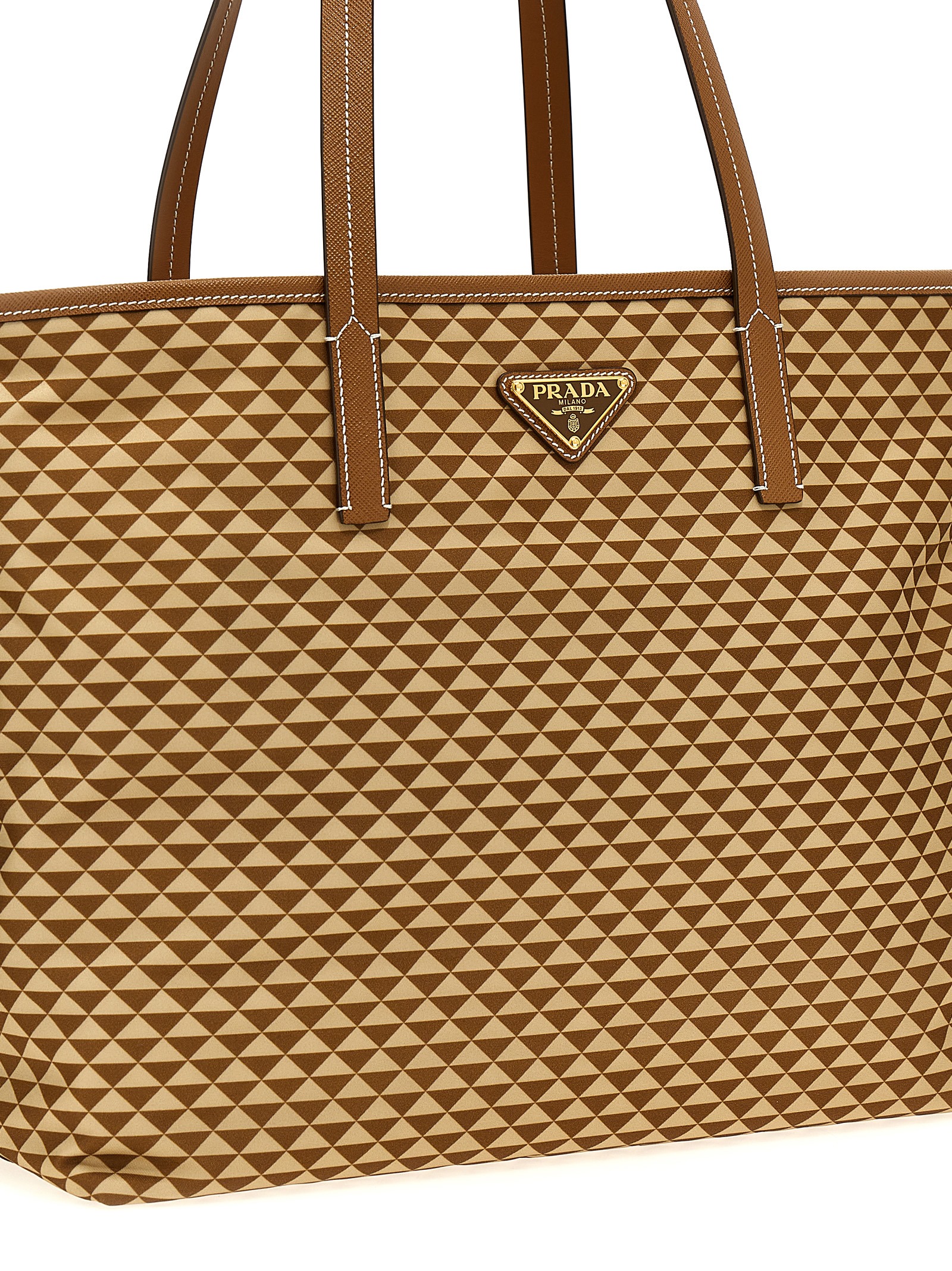 'Prada Symbole' shopping bag in Tria fabric with Saffiano leather piping, front enameled triangle logo, double fixed handle.