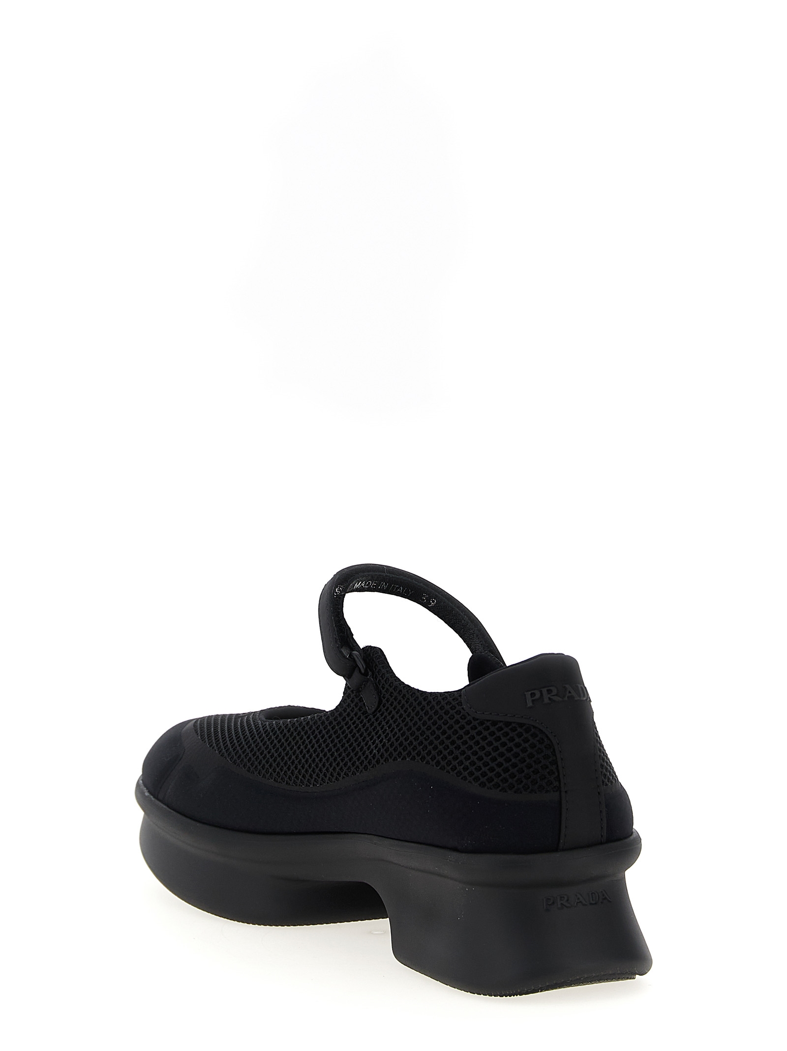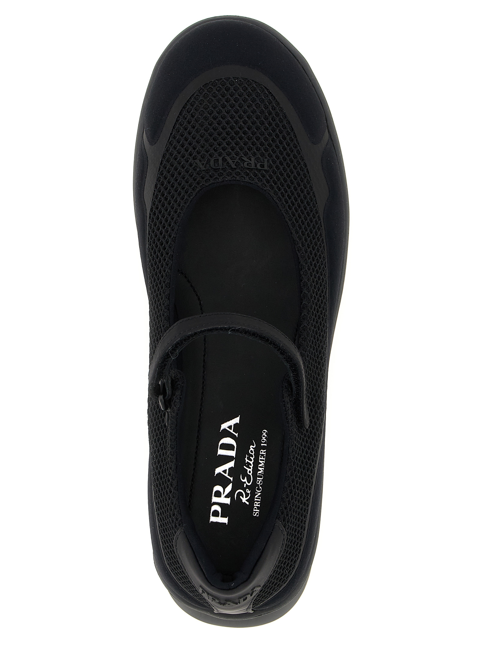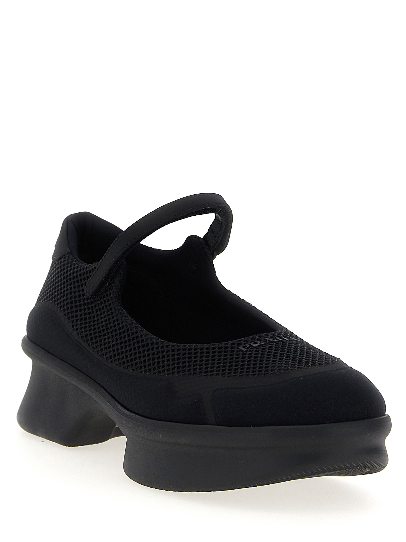 Openwork mesh ballet flats with tone-on-tone logo lettering on the front and back, Adjustable strap with velcro, oversized rubber sole.