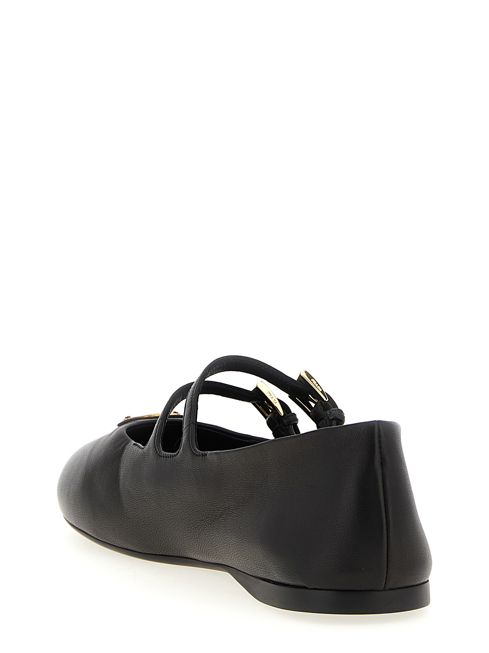 Nappa ballet flats, round toe with triangle logo in enameled metal on the front, double adjustable strap, rubber sole.