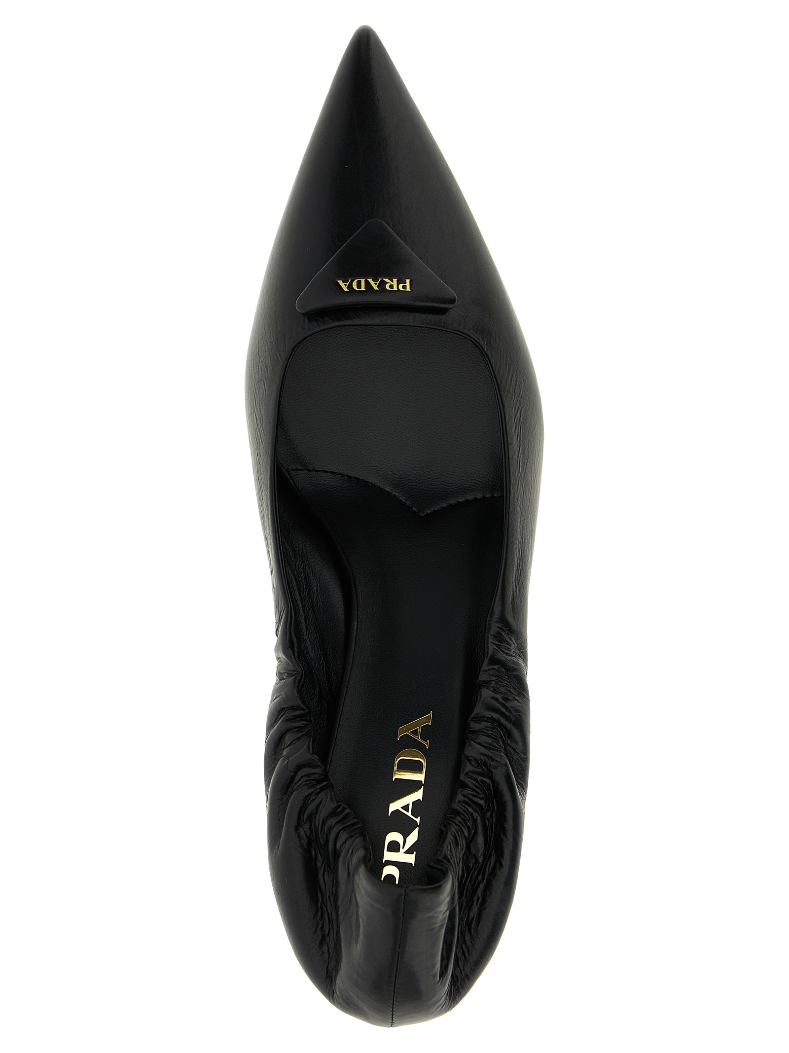 Leather pointed pumps with tone-on-tone triangle logo with embossed logo on the front, elastic back, architectural heel inspired by the geometry of the iconic triangle, leather sole.