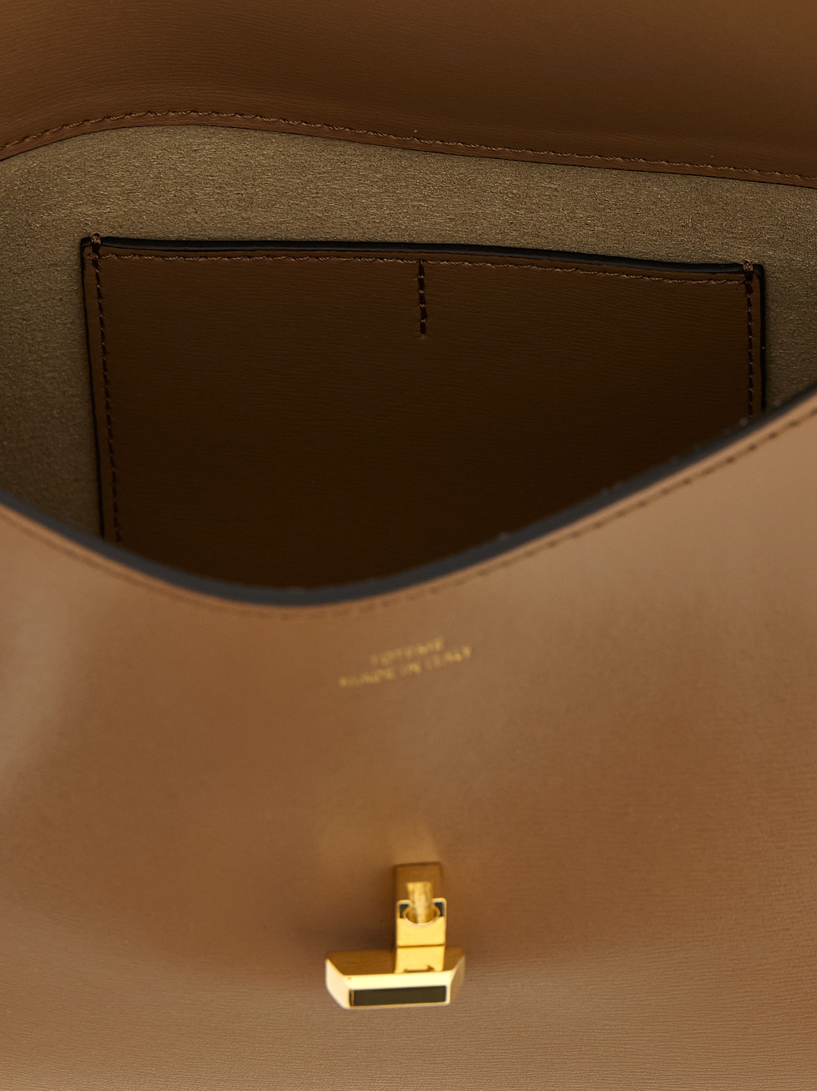 'T-Lock Leather' slightly Palmellatta leather clutch Textured, flap closure with metal spin, adjustable and removable shoulder strap, metal details.