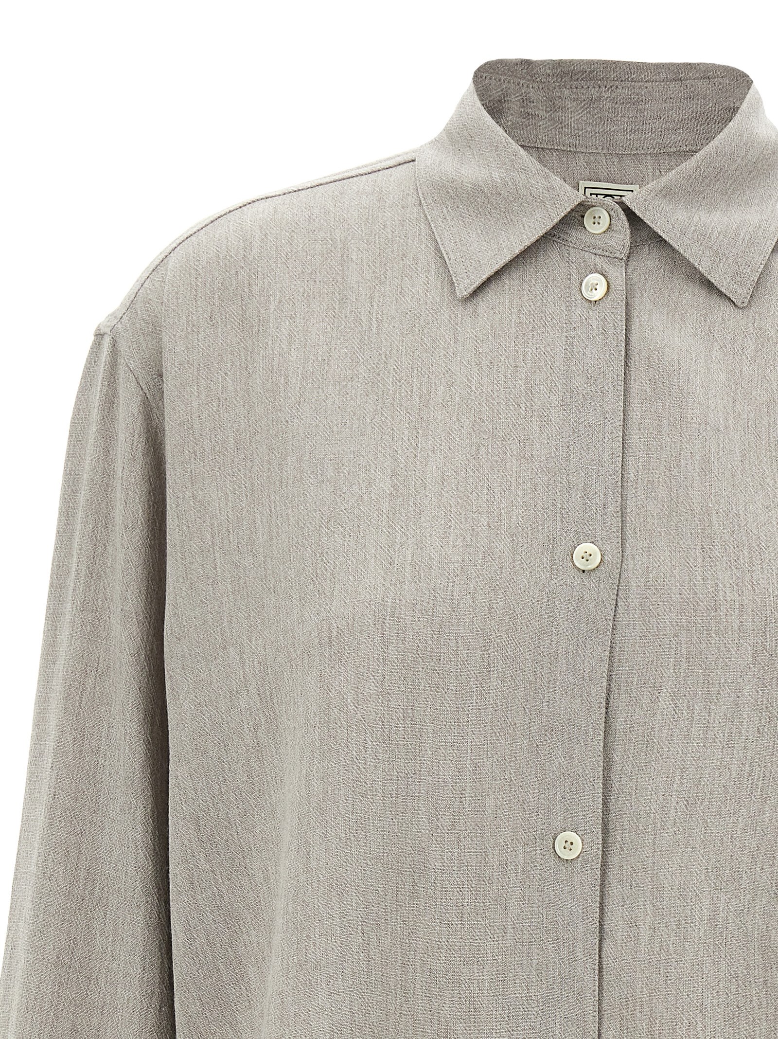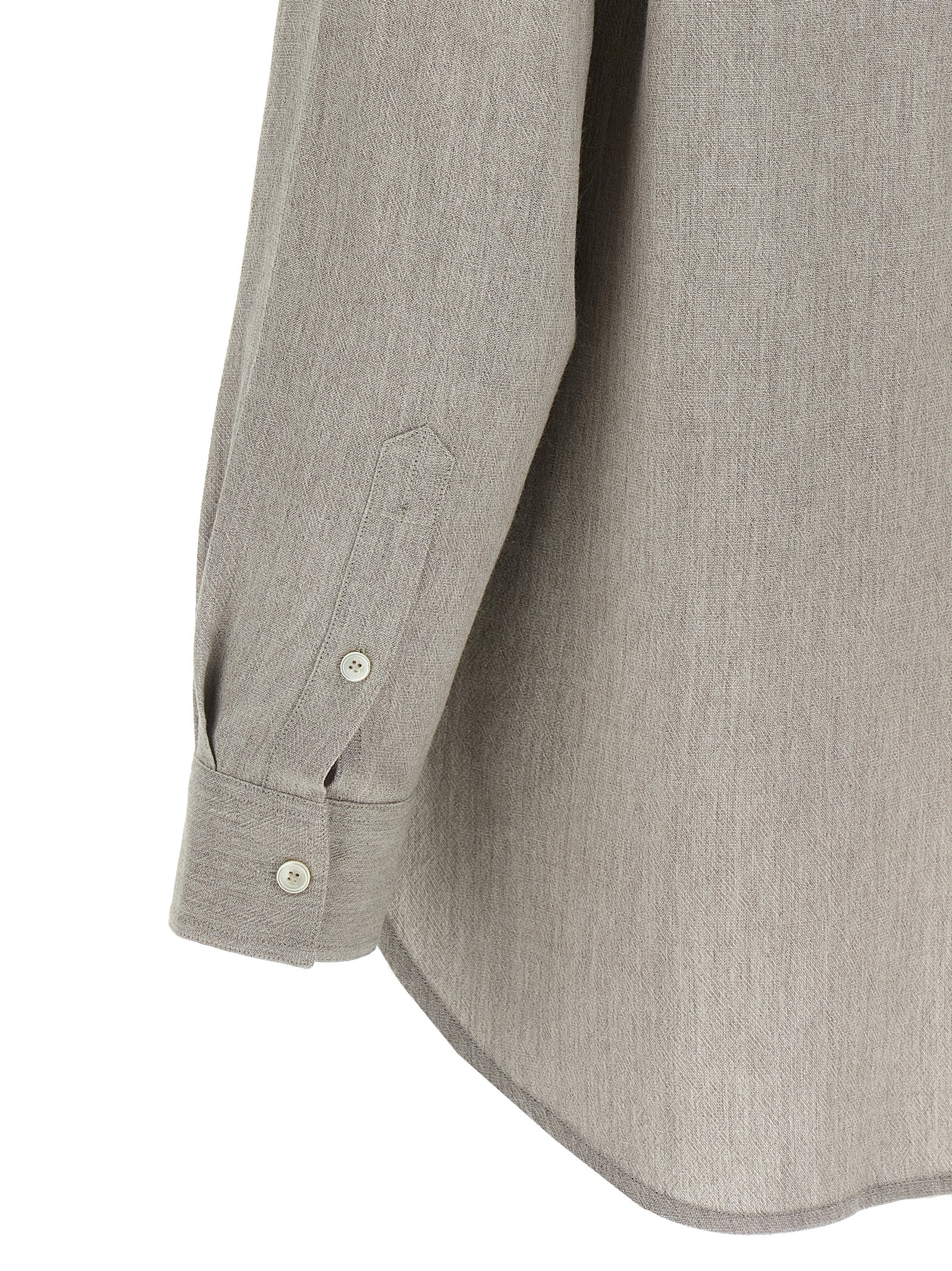 Wool blend shirt with slightly loose fit, side slits, longer at the back, front button closure, long cuffed sleeves.