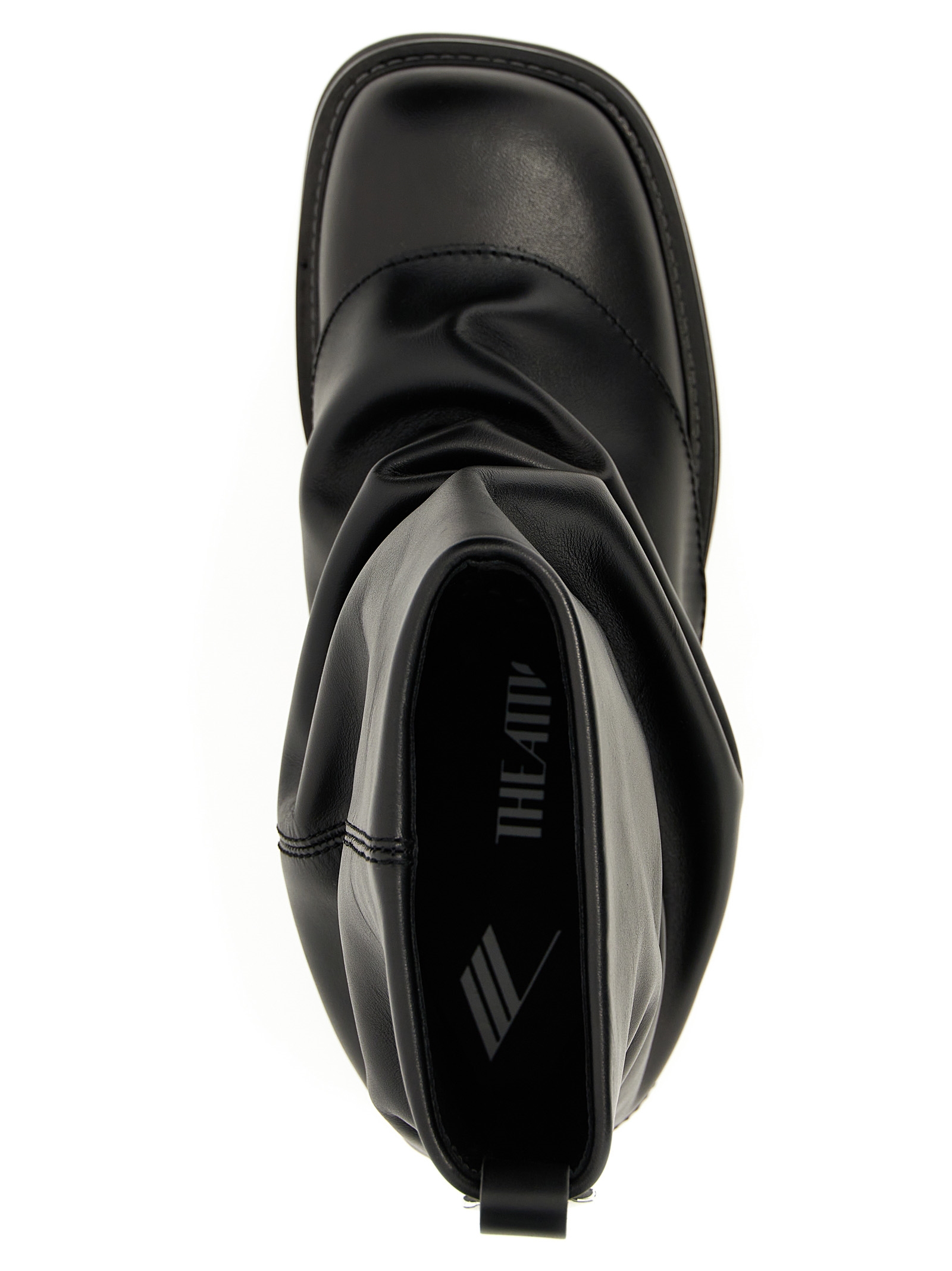 'Mini Robin Combat' crinkled leather ankle boots with rounded toe, metal logo on the back tab, leather sole.