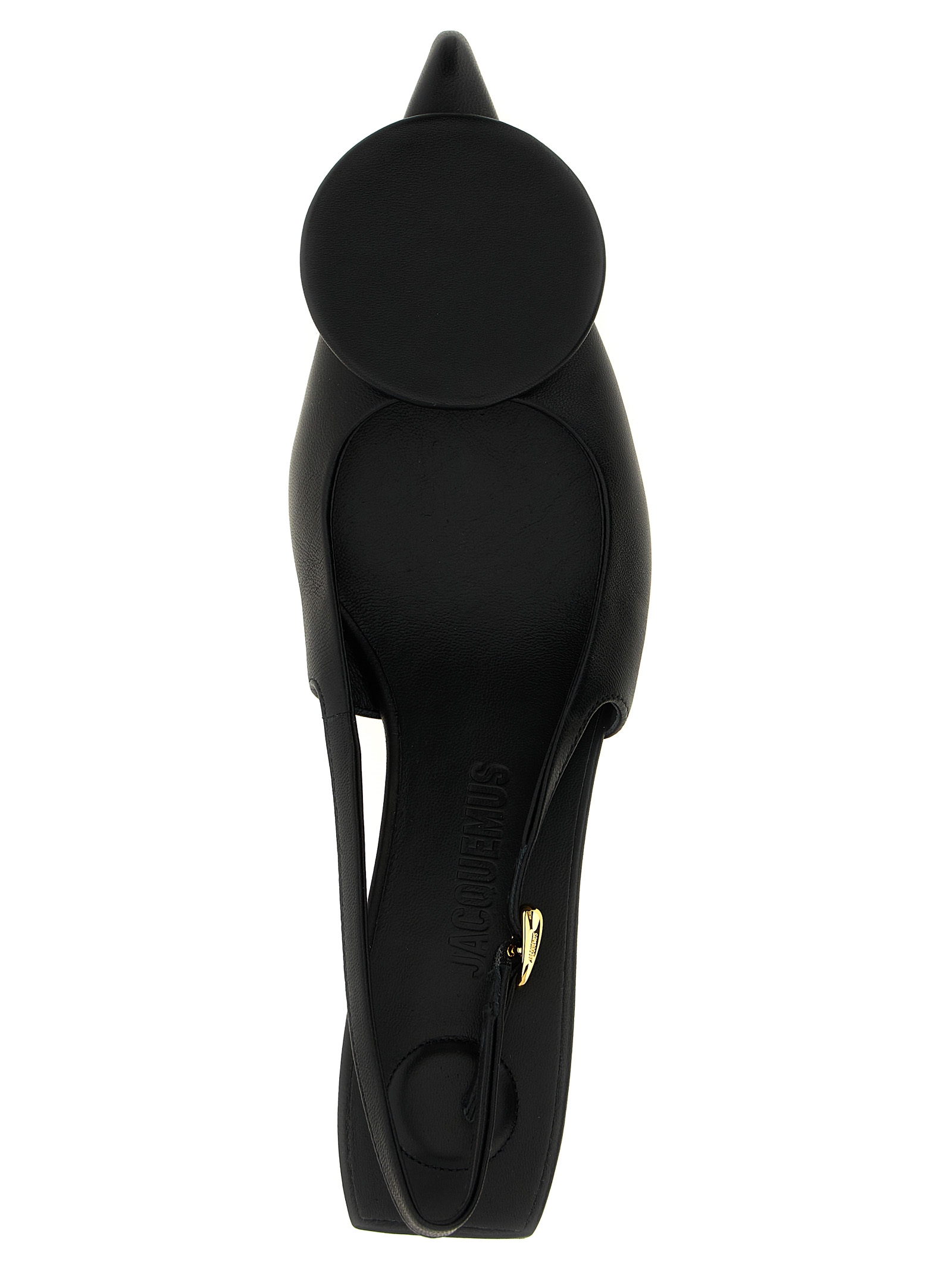'Duelo B' leather slingbacks, pointed model with different front detail application for each shoe, adjustable strap, padded insole, leather sole, heel.