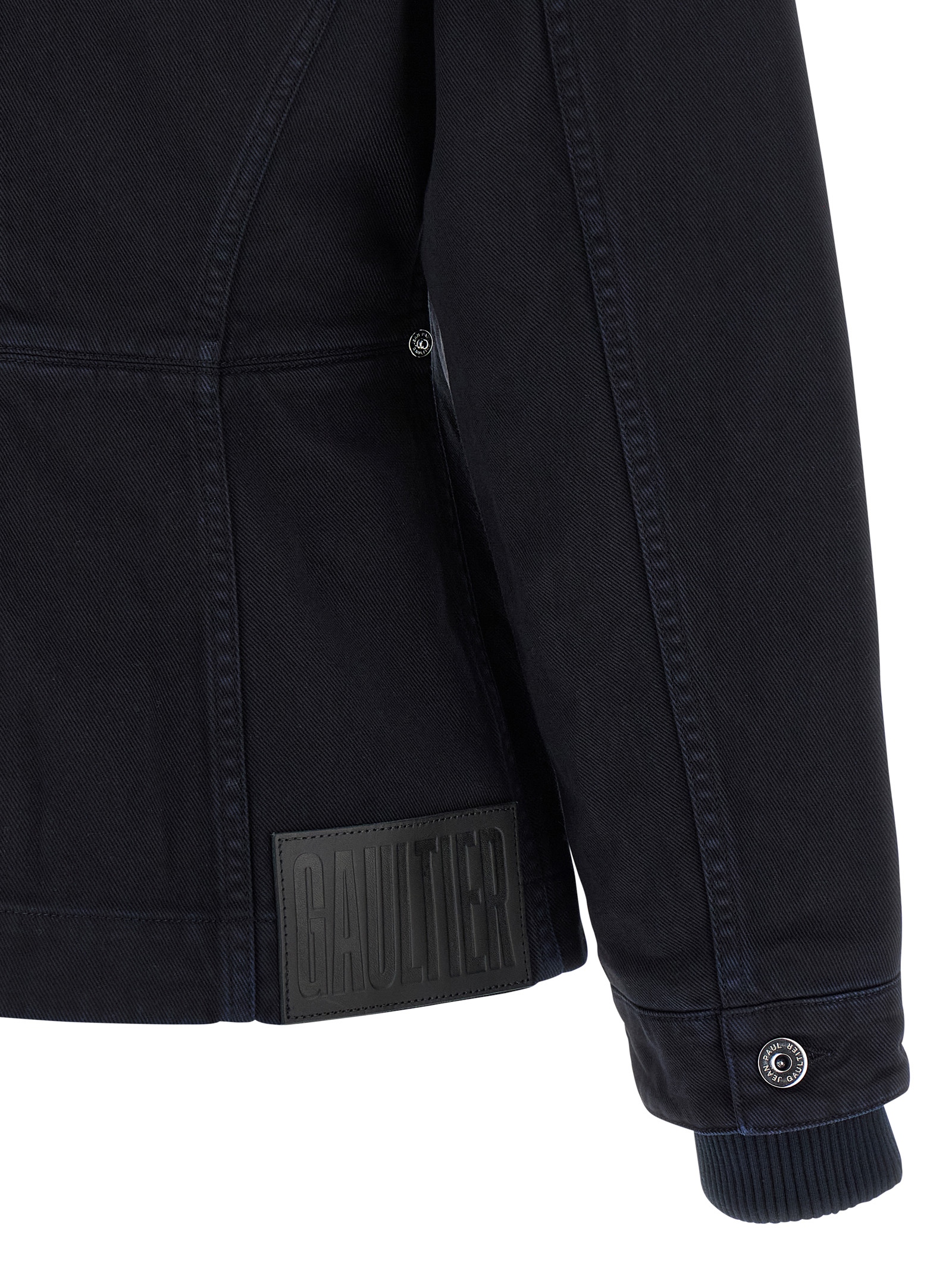 The Slit Denim' cotton denim jacket with stretch ribbed knit details, zip closure and front splits, hourglass silhouette, pockets, long sleeves with double layer cuffs and dropped shoulders, back logo tag.