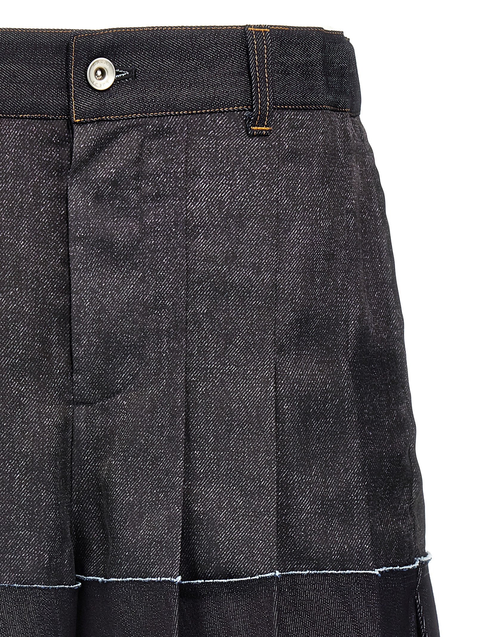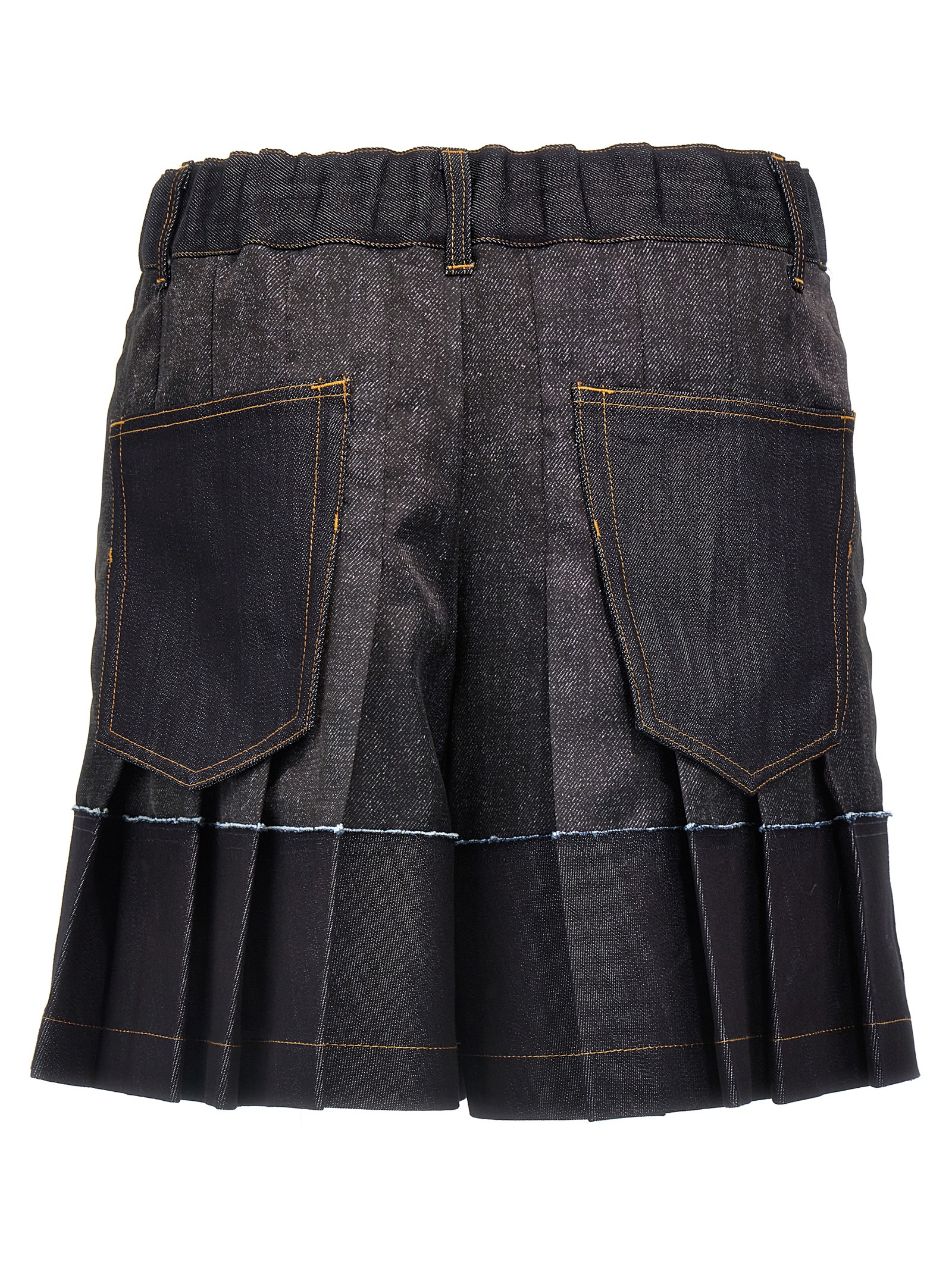 Denim print synthetic fabric shorts with cotton denim details, flounced model with wide leg, zip and button closure, elastic waistband, pockets.