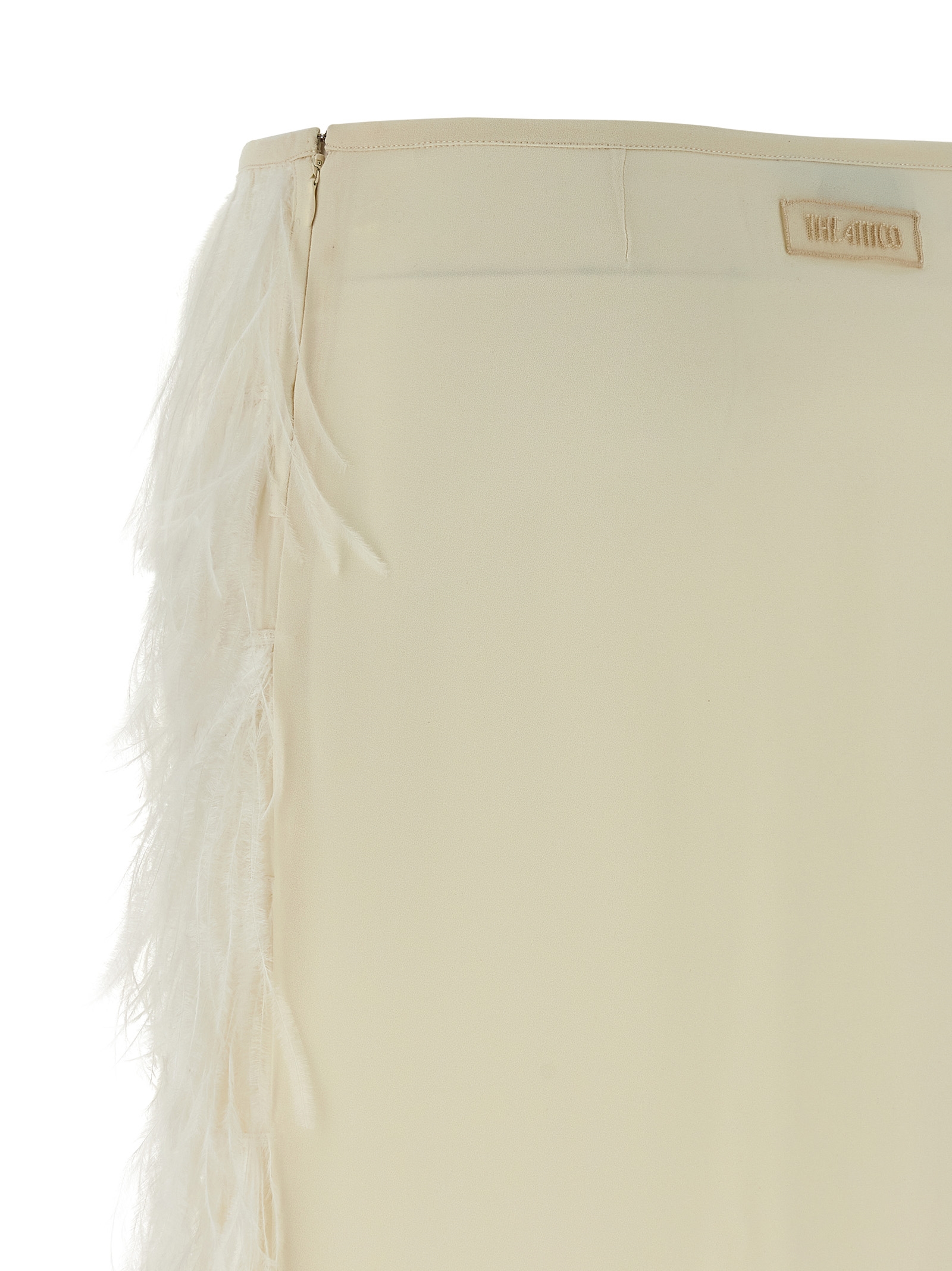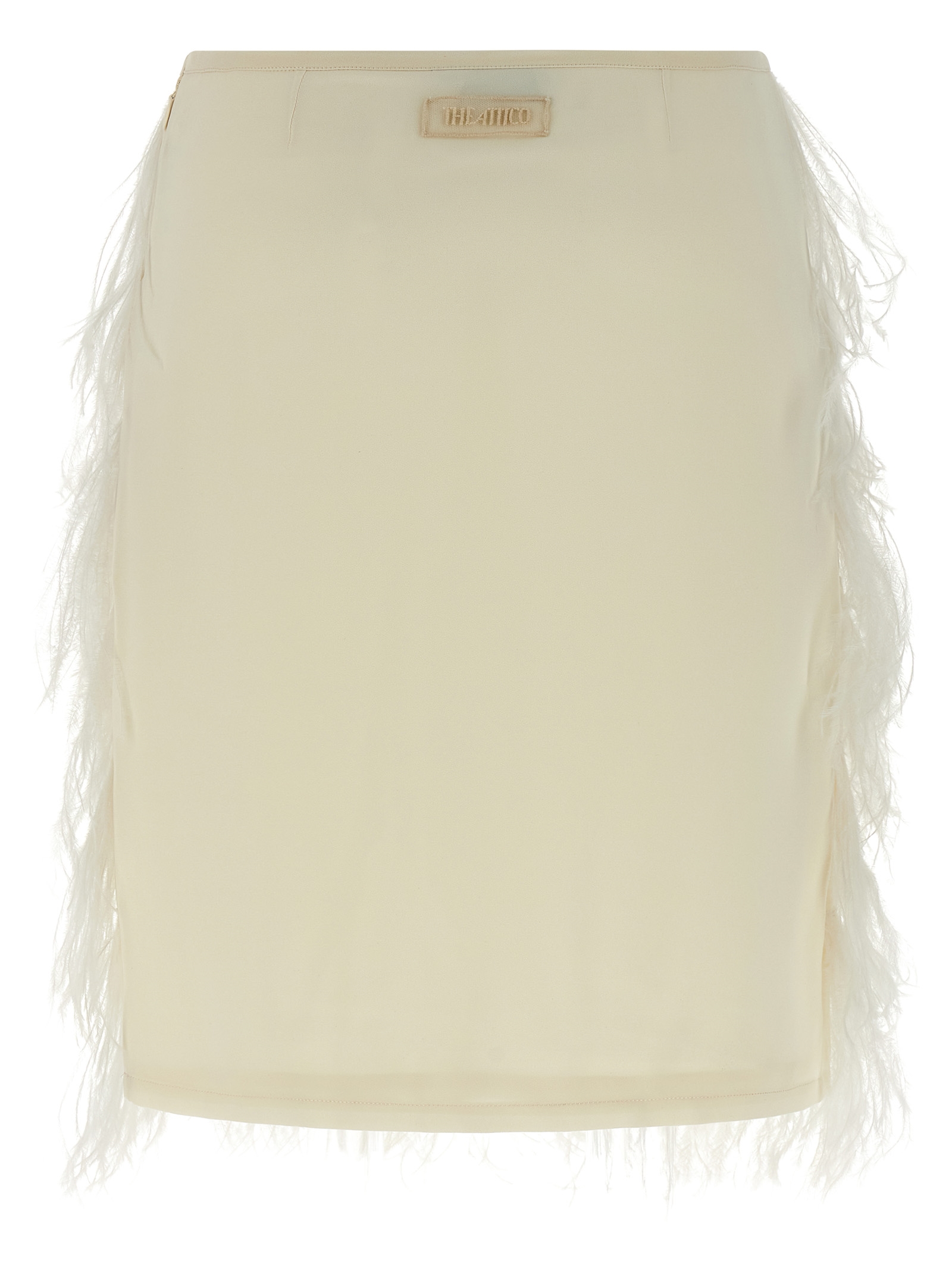 Fabric midi skirt with front ostrich feather application, sheath dress, underskirt, side zip closure, back logo patch.