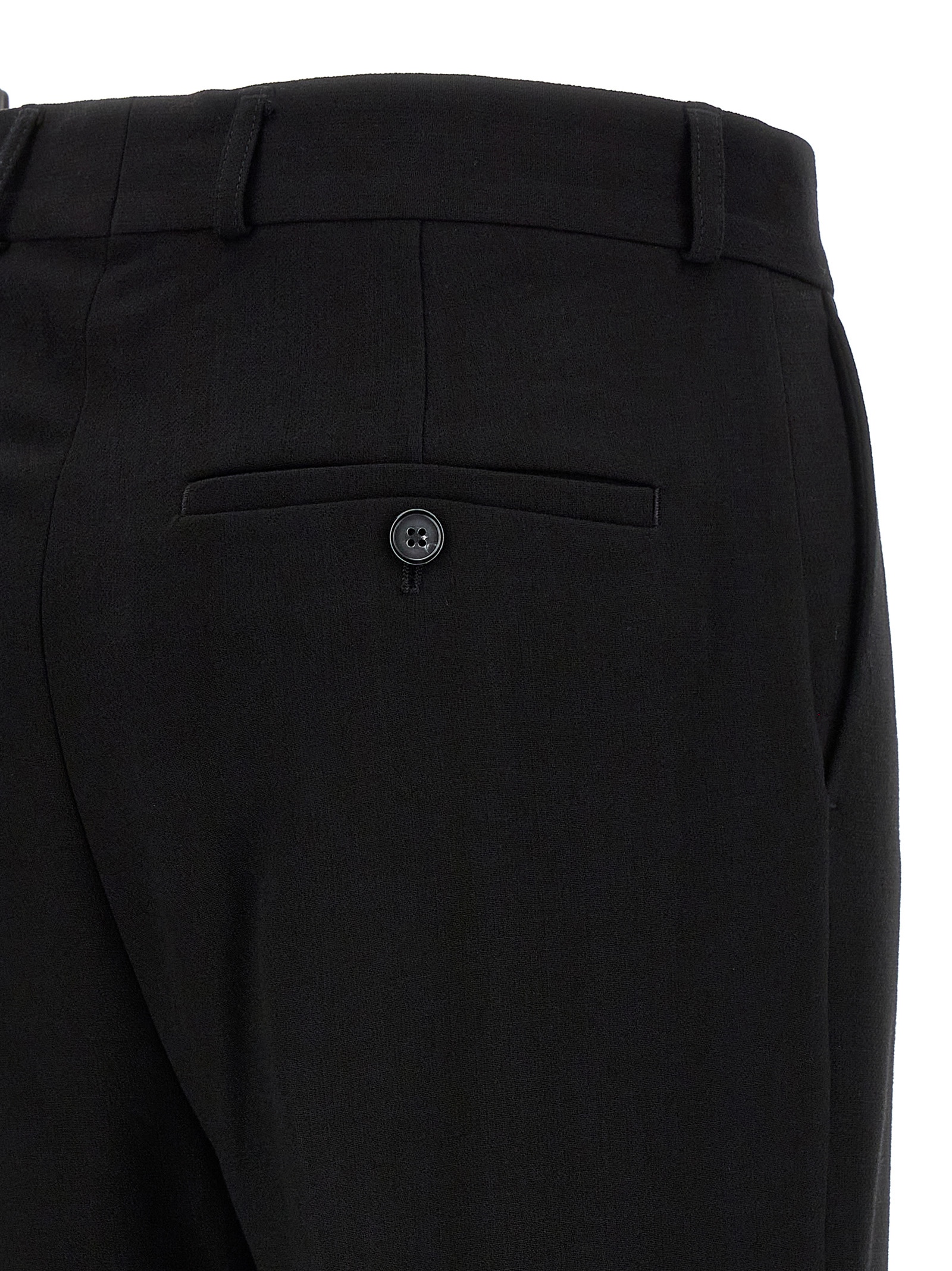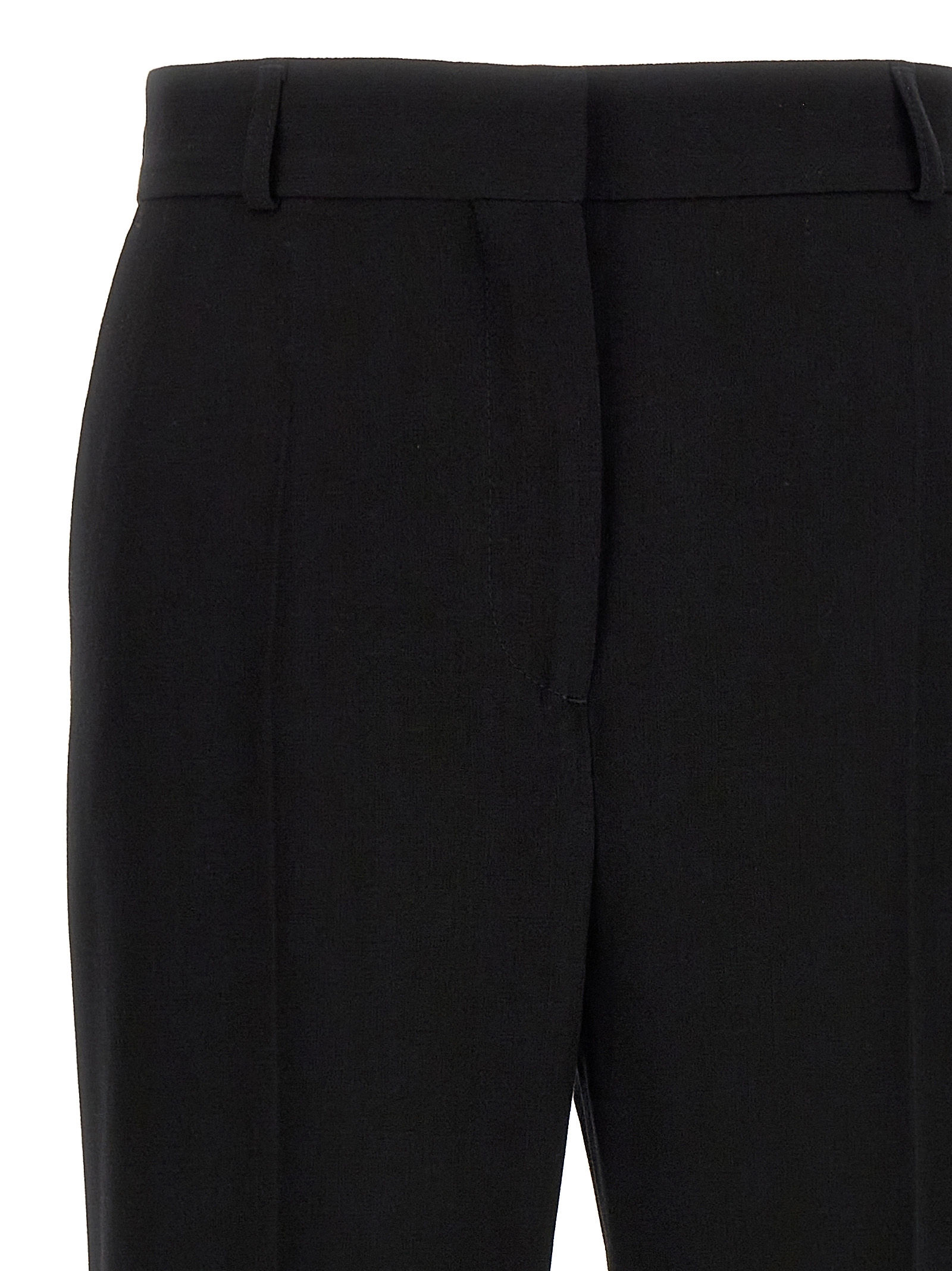 Viscose and wool blend trousers, flared leg with stretched pleat, hook and button zip closure, pockets.