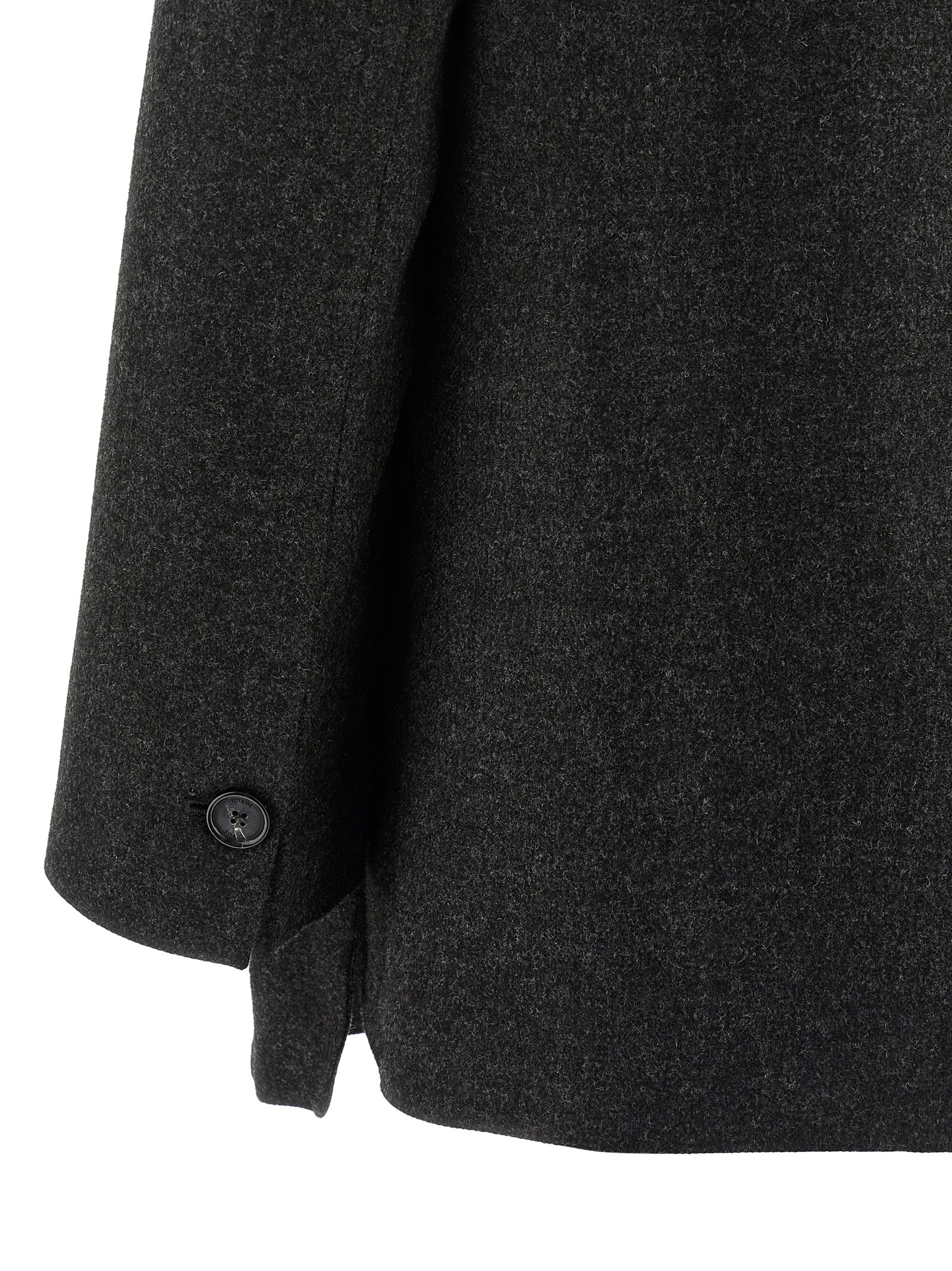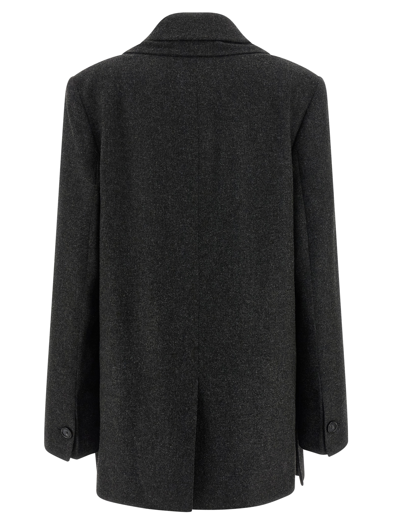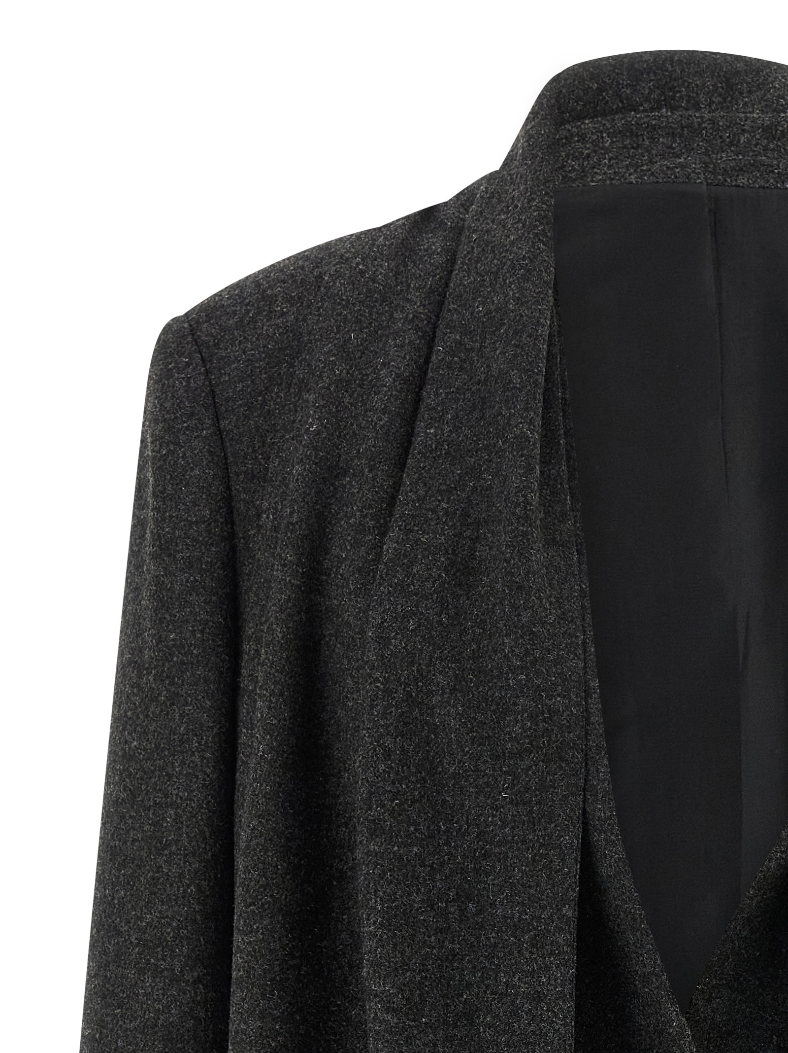Blazer in lightweight mélange flannel, long and straight silhouette, collar with built-in scarf, single-breasted style with front button closure, flap pockets, structured shoulder strap, long sleeves, back split, lining.
