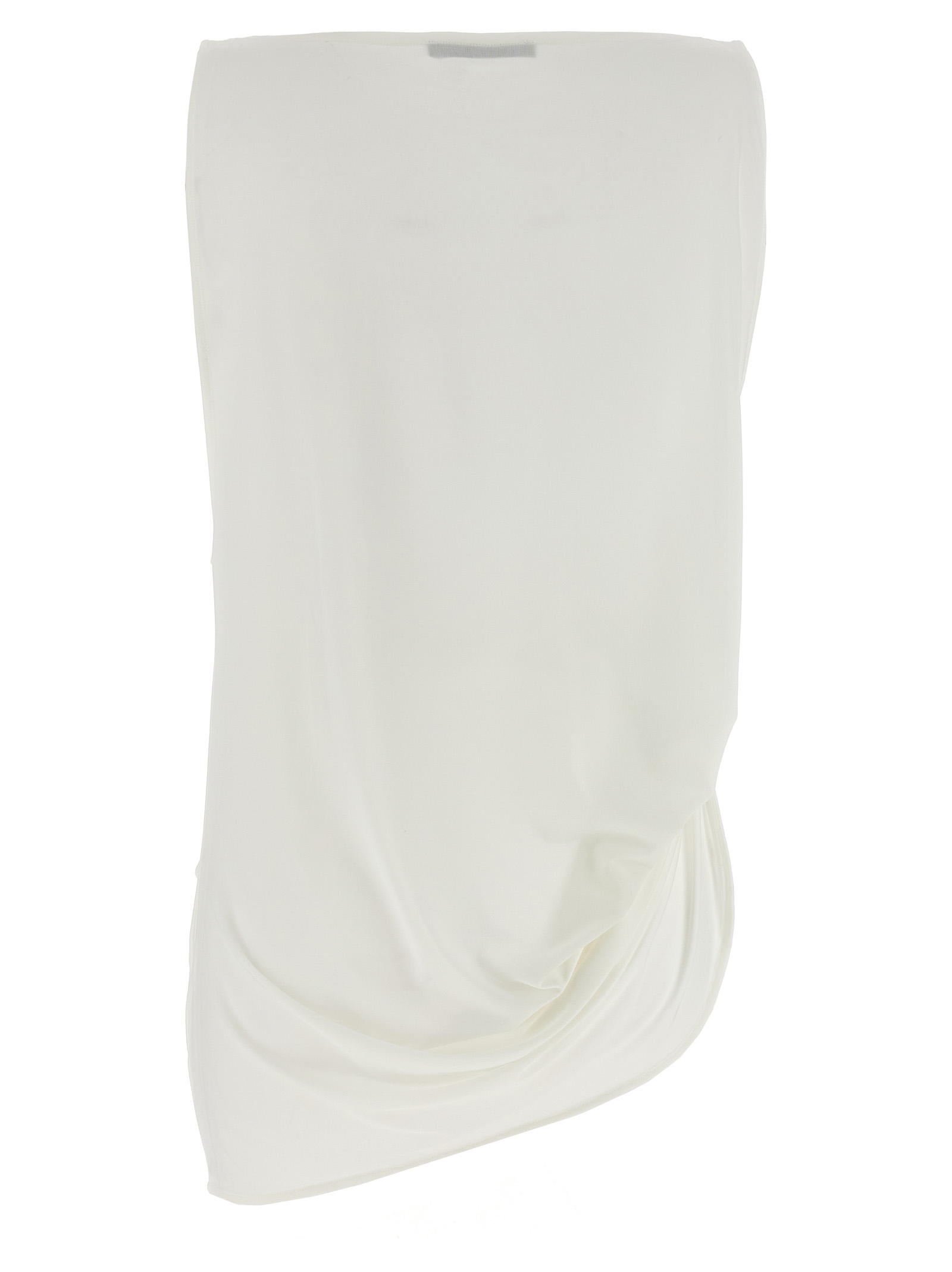 'Le Haut Peplo' fluid jersey top with square neckline, asymmetrical hem with elastic waistband and woven draping, wide sleeve turn on the left and peplums on the right.