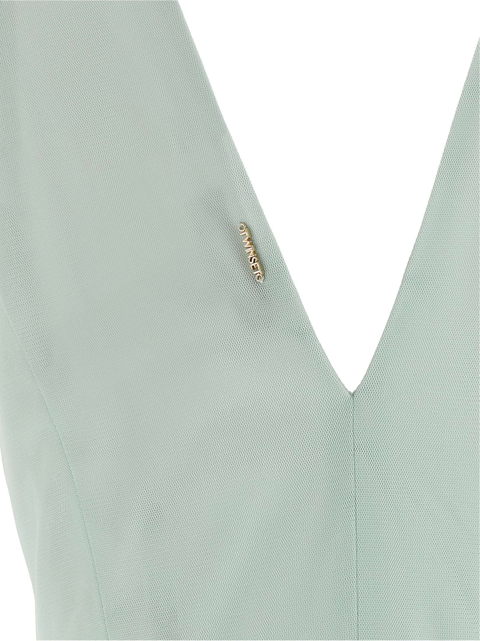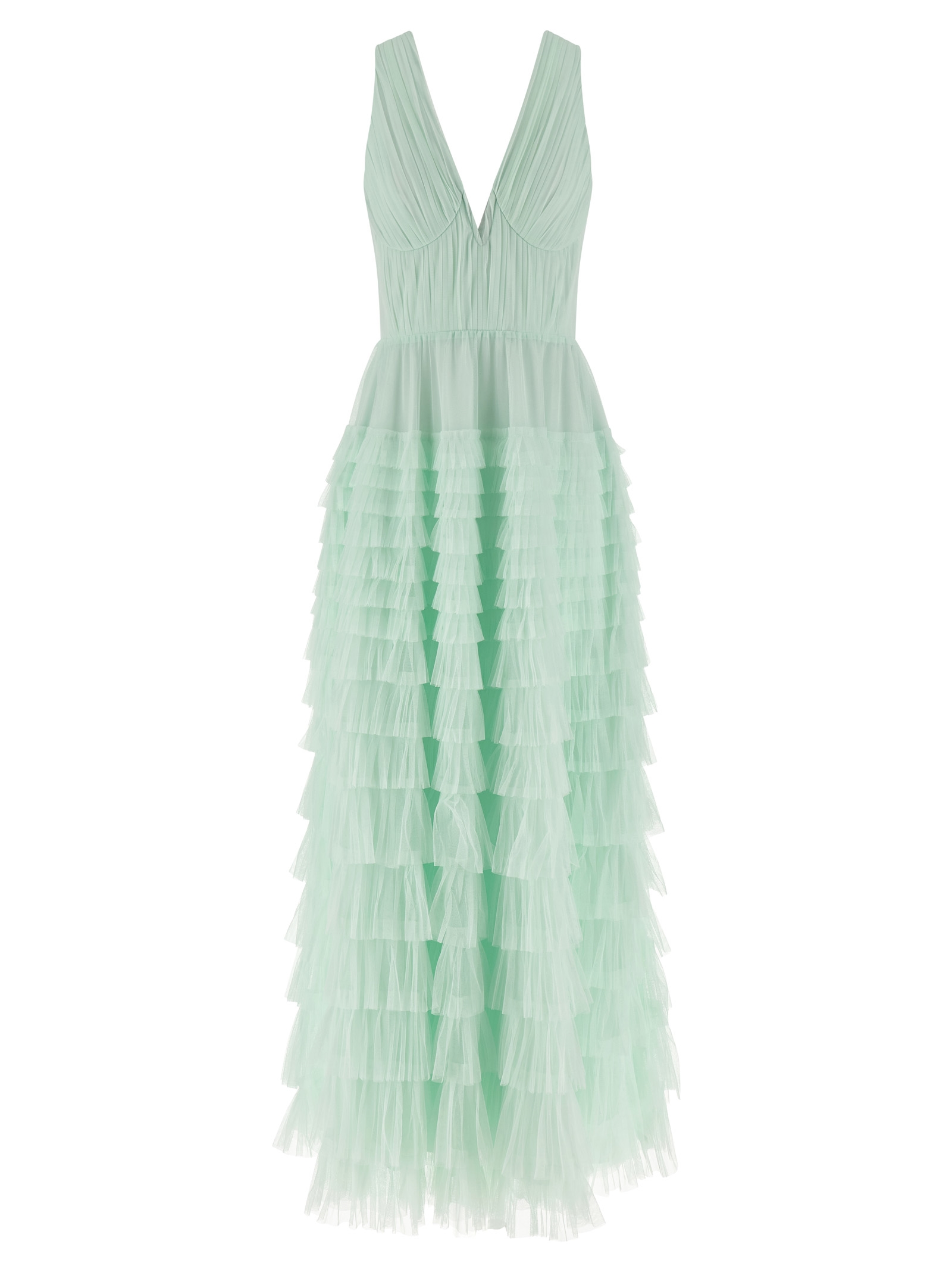 Long tulle dress consisting of bodice top, underwire cup, V-neck on the front and back, sleeveless, side zip closure and voluminous skirt with layered ruffles, lining.