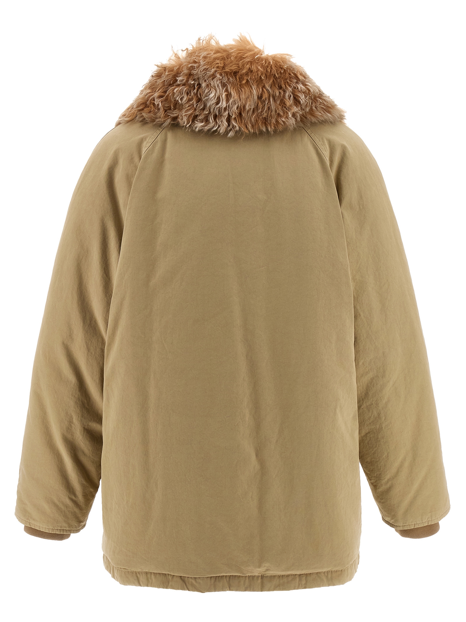 Cotton jacket, shirt collar with removable long-haired fur insert, quilted check print cotton lining with goose down padding, used-effect leather patch with embossed logo on the back, front zip and button closure, pockets, long sleeves with stretch knit cuffs, drawstring at the waist.