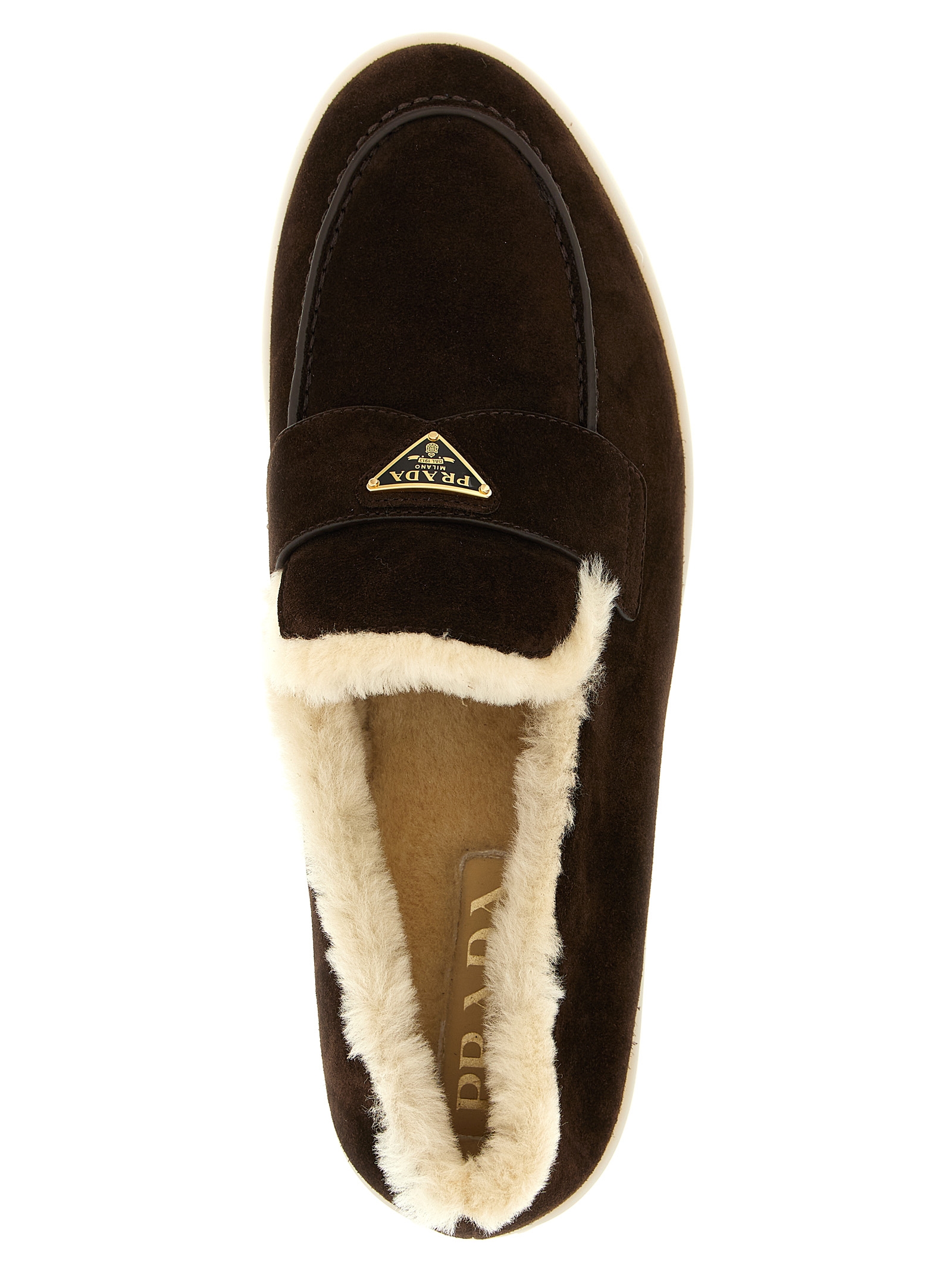 Suede loafers with shearling lining, triangle logo in front enameled metal, rubber sole.