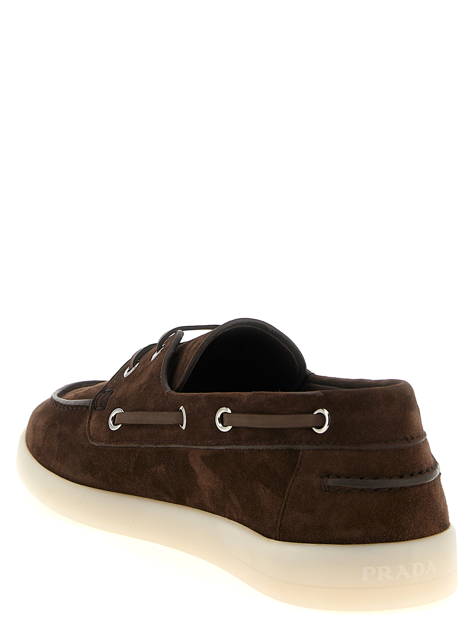 Suede boat loafers with leather laces, metal eyelets, embossed logo detail on the side, rubber sole with back logo.