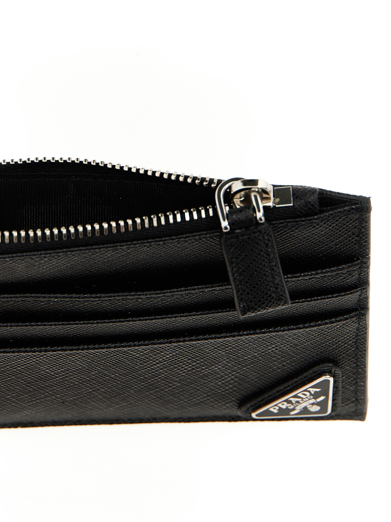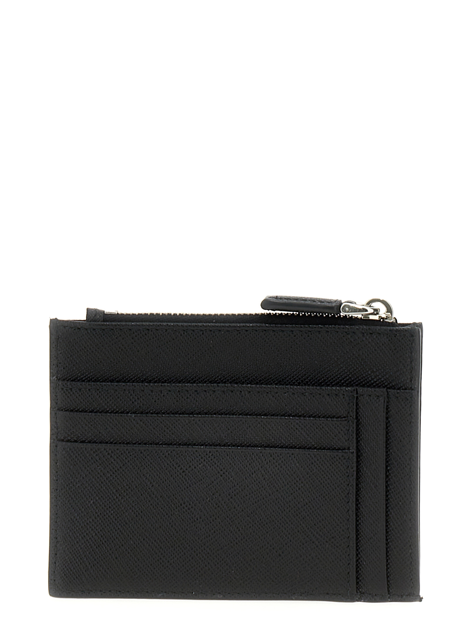 Saffiano leather card holder with triangle enameled metal logo, zip closure, slots for external cards.