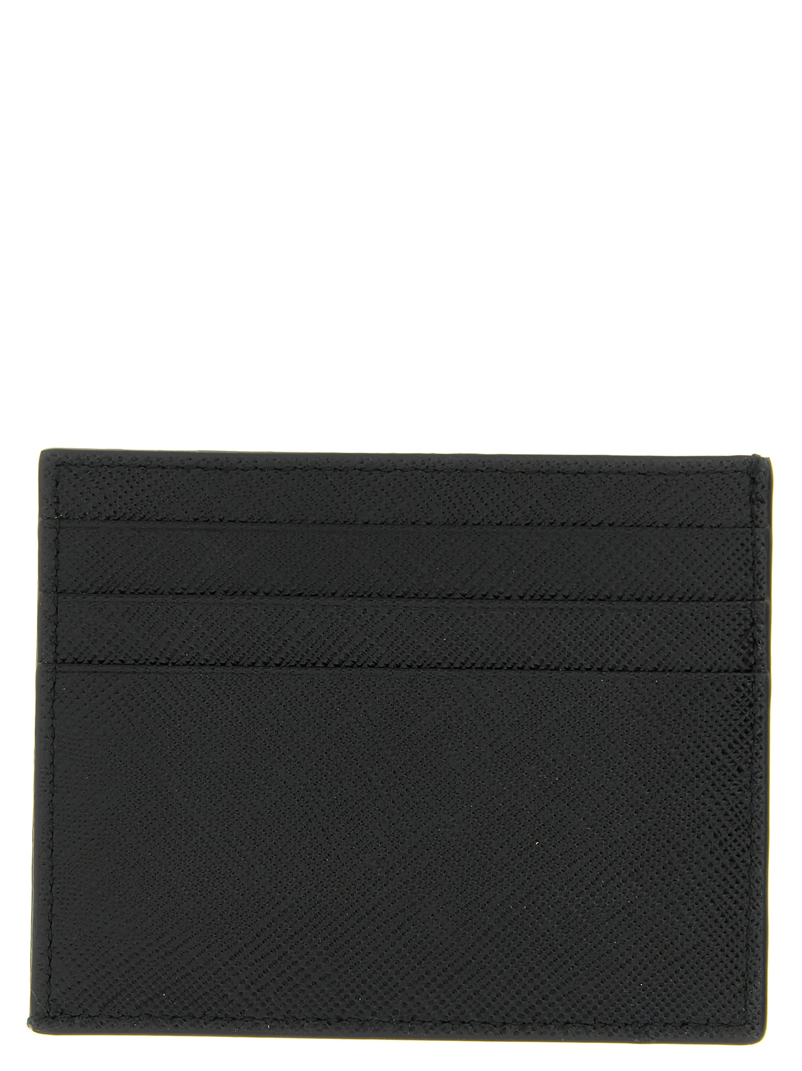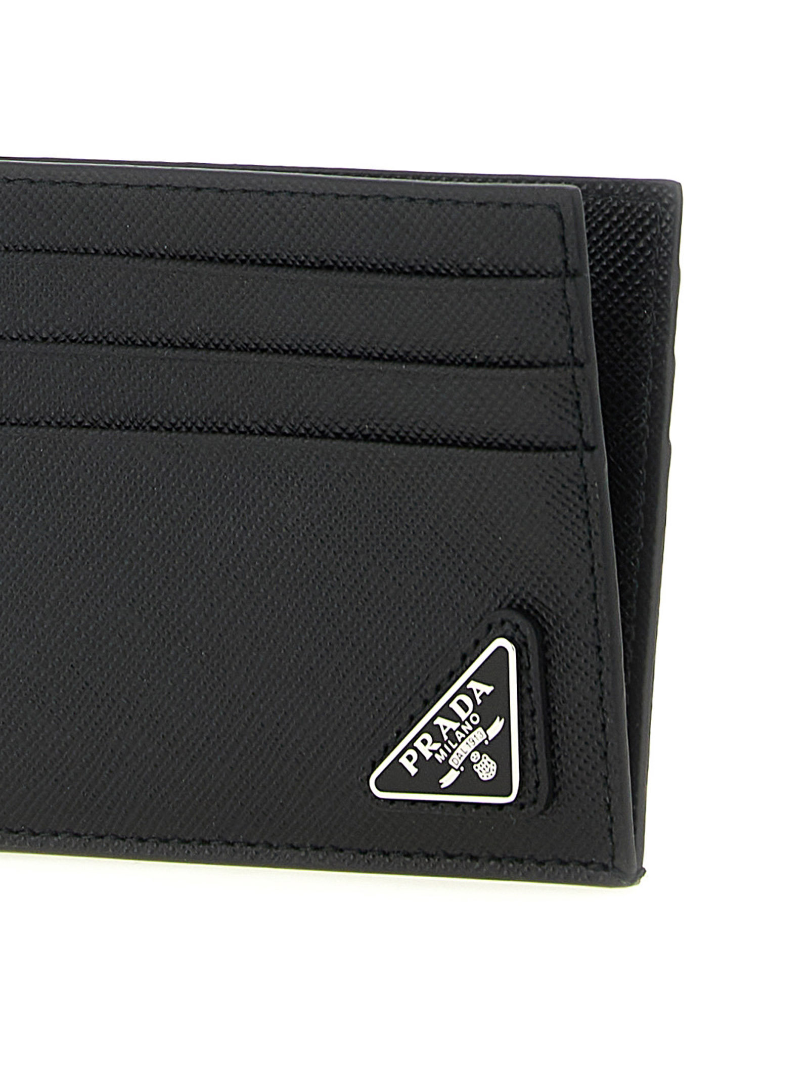 Saffiano leather card holder with triangle metal logo, open on one side.