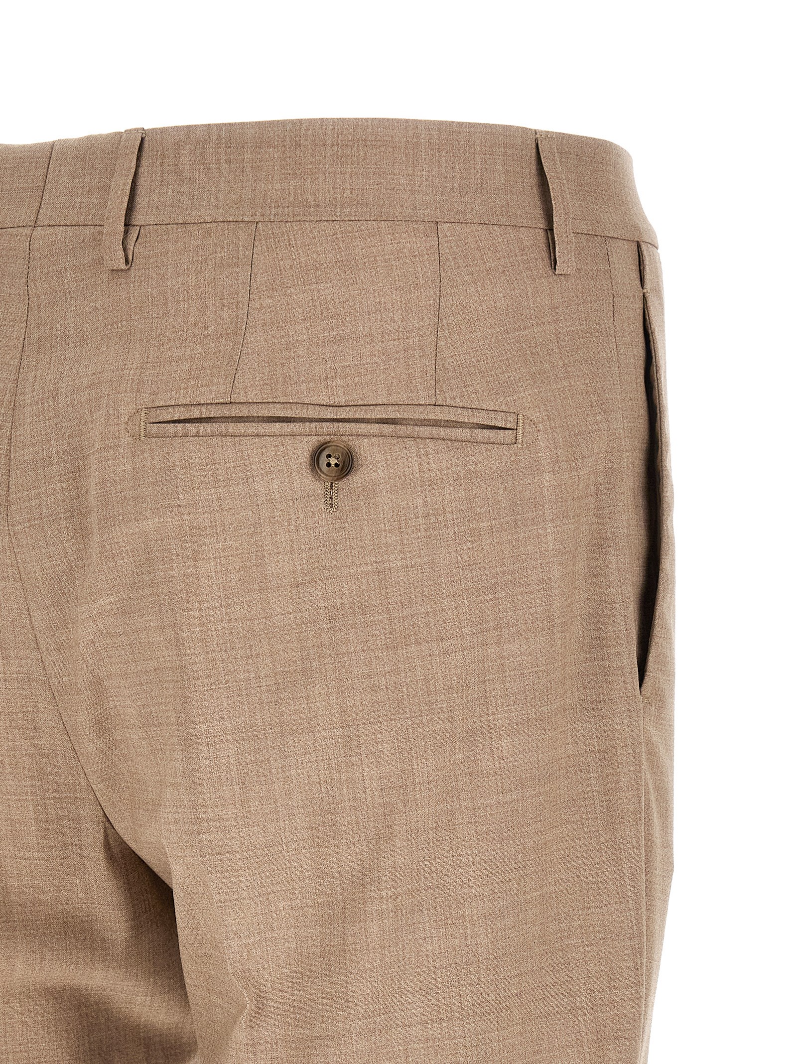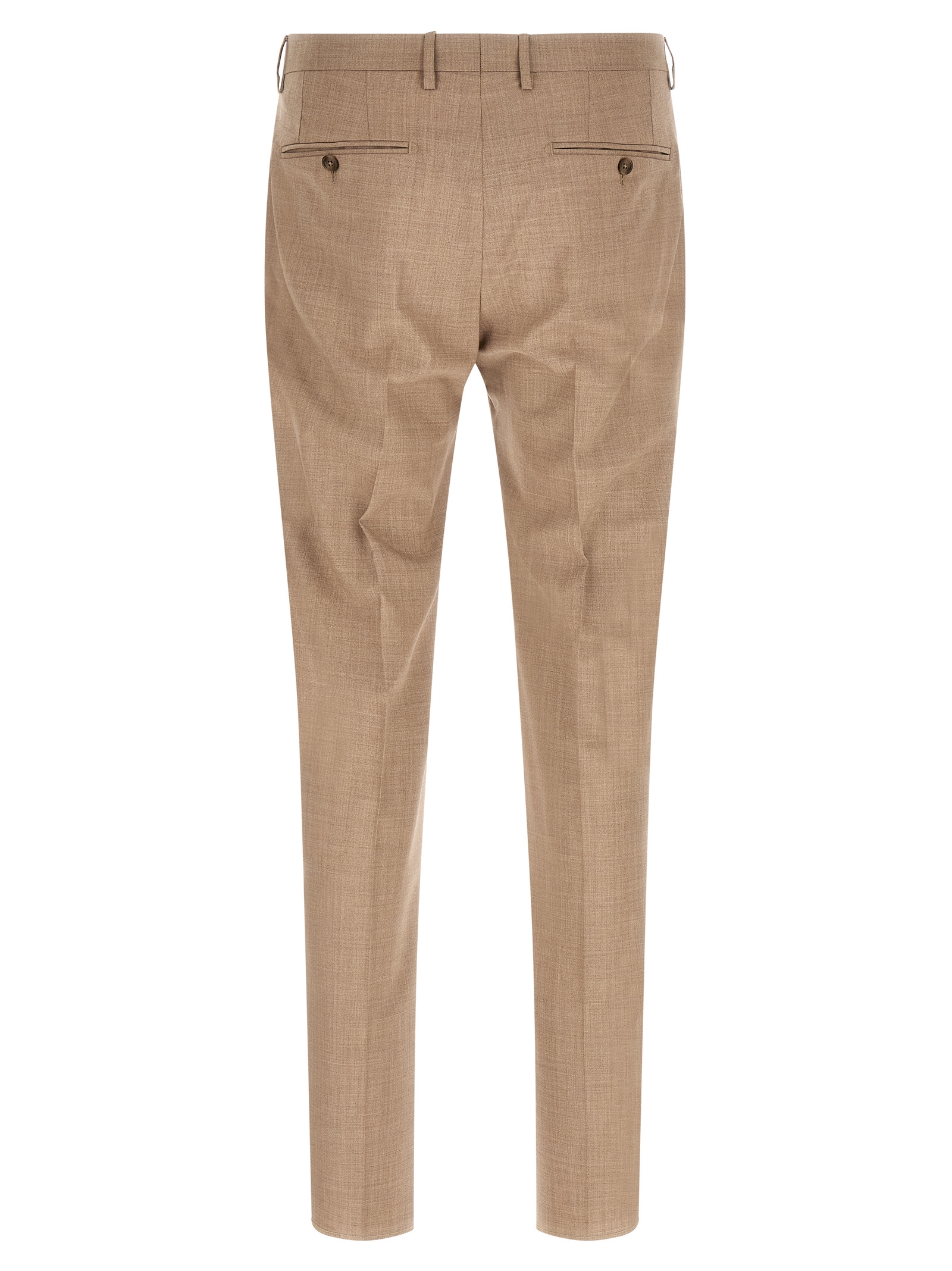 'Montecarlo' dress in virgin wool and mélange silk blend, consisting of single-breasted blazer with front button closure, mirror lapels with removable metal brooch, breast pocket, flap pockets, cupro lining, four inner pockets, cuffs with open buttonholes, back slits and trousers with stretched pleat, front 'americane pockets', back welt pockets, front zip and button closure, cotton lining.