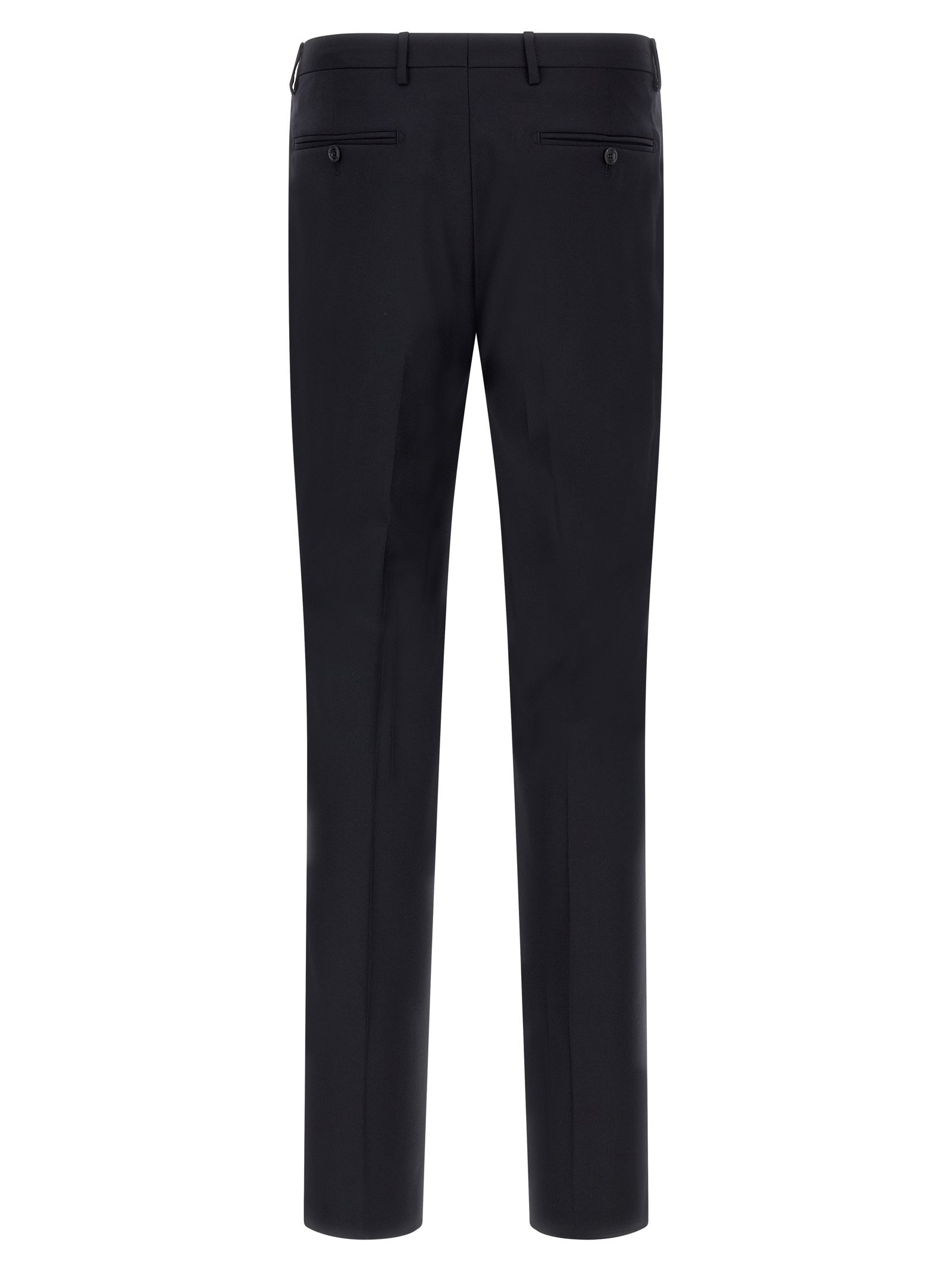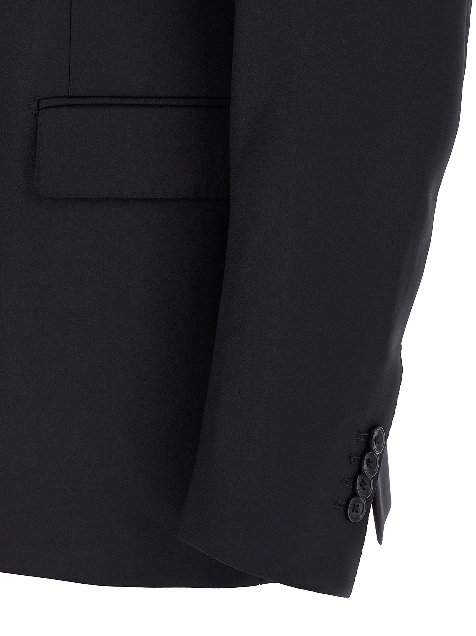 Super 110's virgin wool Vesuvio dress consisting of double-breasted blazer with front button closure, peak lapels with removable metal brooch, breast pocket, flap pockets, cupro lining, two inner pockets, buttonhole cuffs, back slits and stretched pleat trousers, front 'americane pockets', back welt pockets, front zip and button closure, cotton lining.