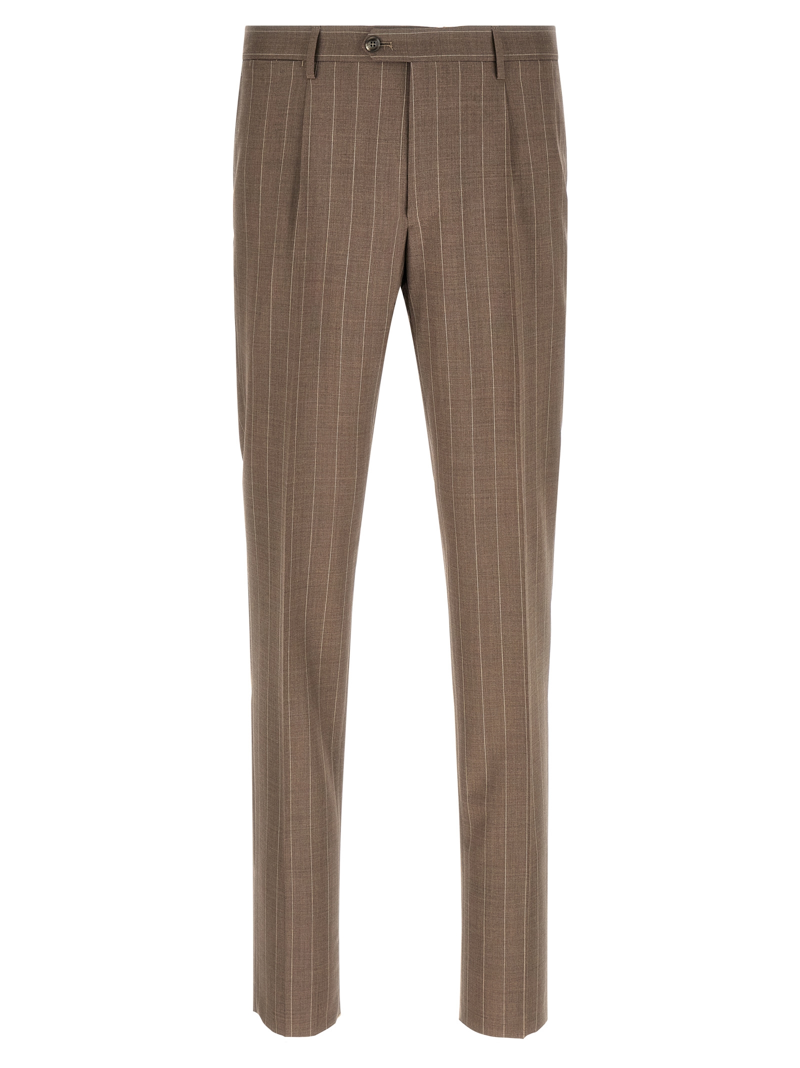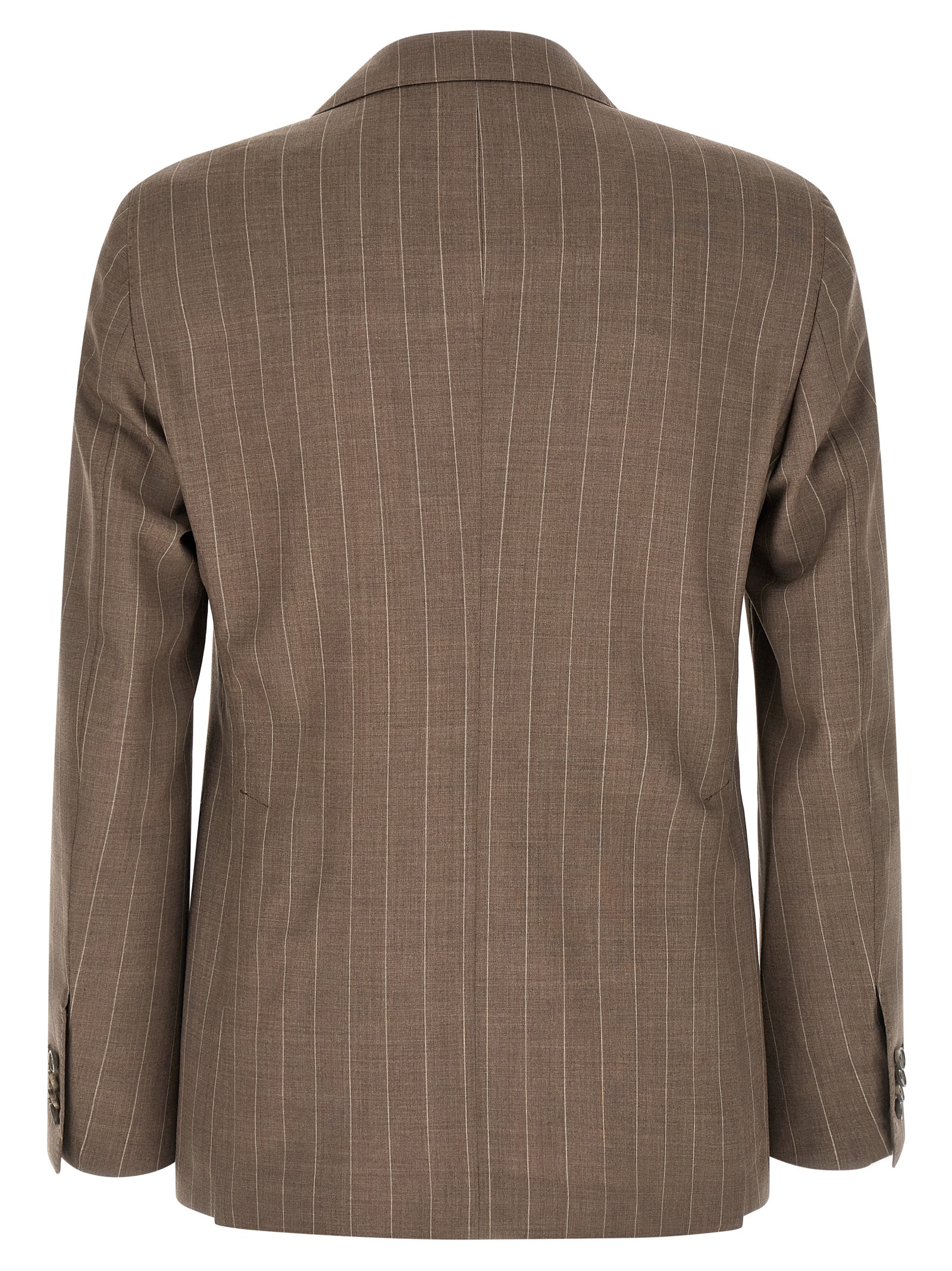 Super 130's pinstriped virgin wool dress Vesuvio consisting of double-breasted blazer with front button closure, peak lapels with removable metal pin, breast pocket, flap pockets, cupro lining, four inner pockets, cuffs with open buttonholes, back slits and trousers with stretched pleat, front 'americane pockets', back welt pockets, front zip and button closure, cotton lining.