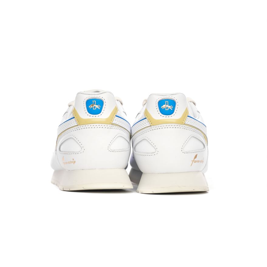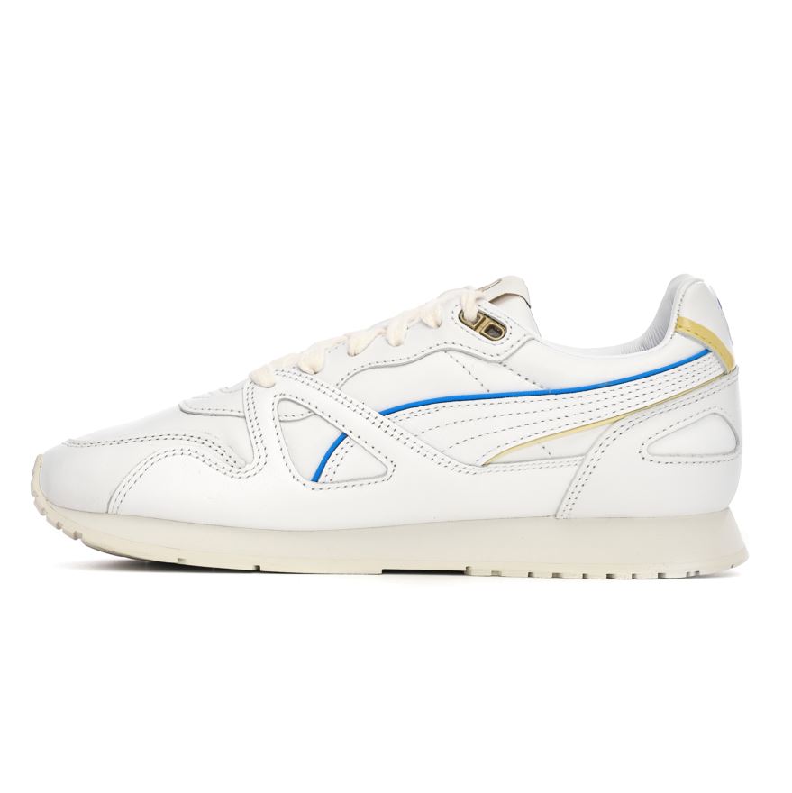 Puma Mirage OG RDL FS w kolorze białym z niebieskimi wstawkami. Cholewka została wykonana ze skóry, gumowa podeszwa zapewnia wygodę i amortyzację. Wisiorek w kolorze złota, logo na języku, boku i pięcie.