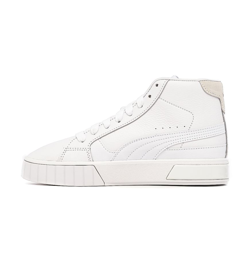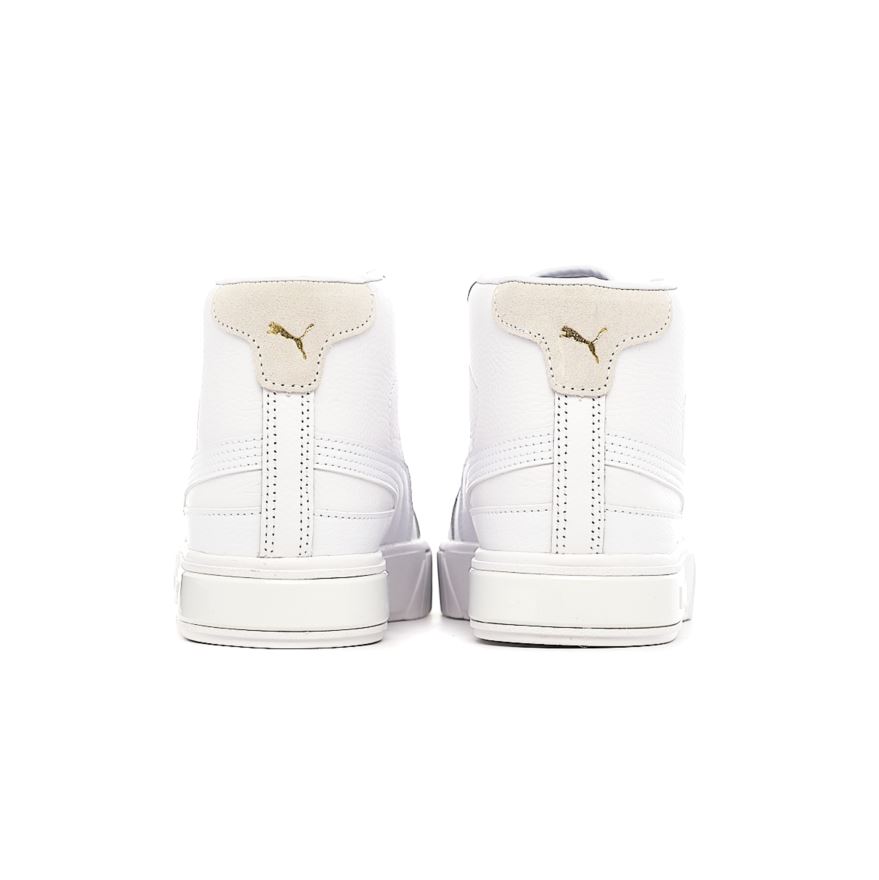 Puma Cali Star Mid Wn's w kolorze białym. Wierzch buta został wykonany z połączenia skóry naturalnej i syntetycznej. Wysoki fason buta zwiększa stabilizację stopy, a usztywniony zapiętek zapobiega odkształceniom. Miękka, tekstylna wyściołka dba o komfort wewnątrz obuwia. Wytrzymała, gumowa podeszwa z gumy zapewnia lekką amortyzację i gwarantuje przyczepność do podłoża. Jednolita kolorystyka modelu została przełamana złotymi akcentami, dzięki czemu buty posiadają uniwersalną sylwetkę pasującą do każdej stylizacji.
