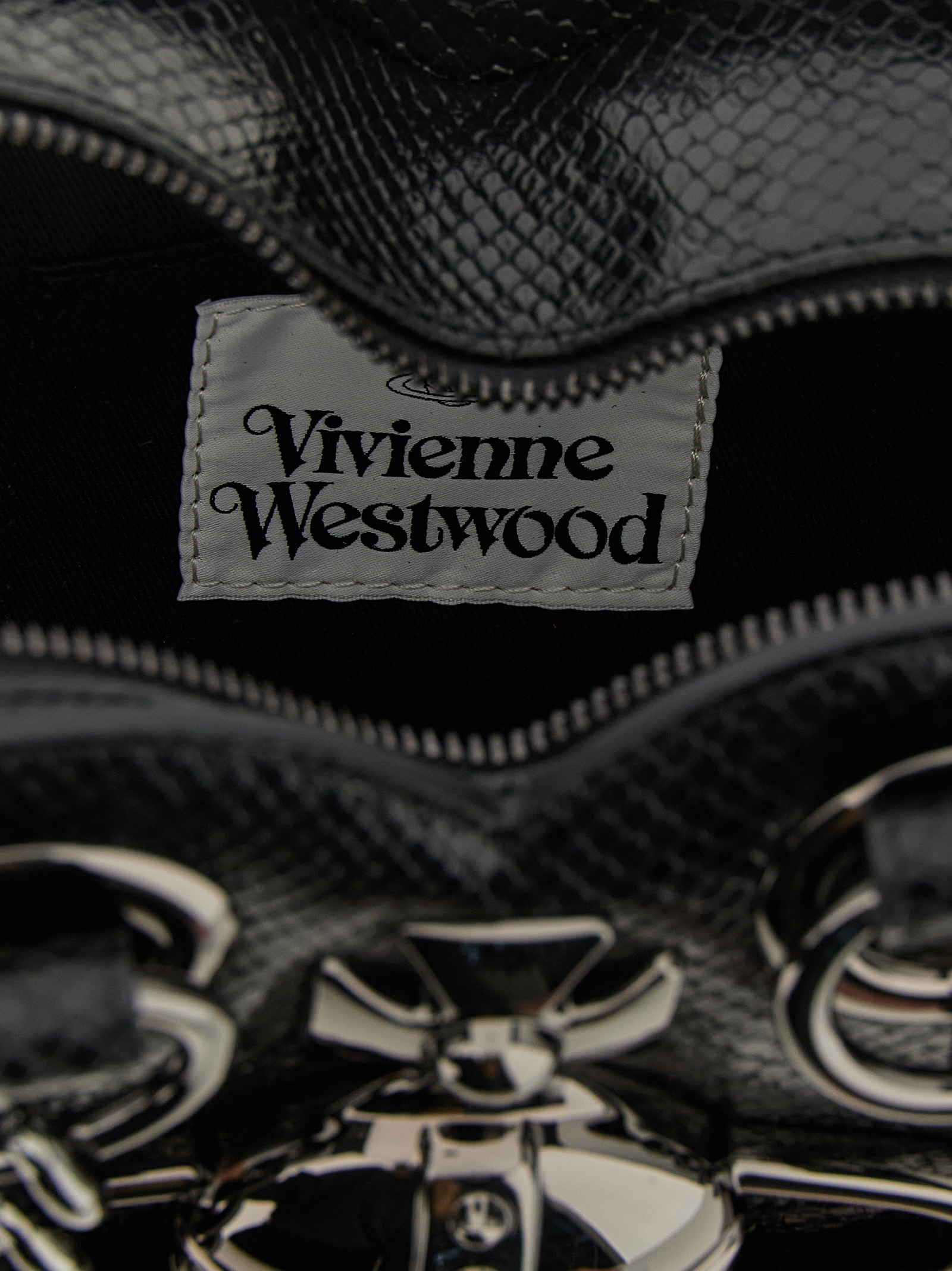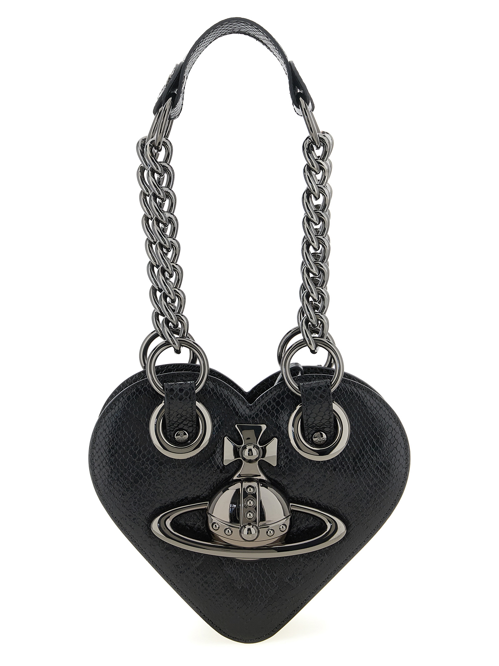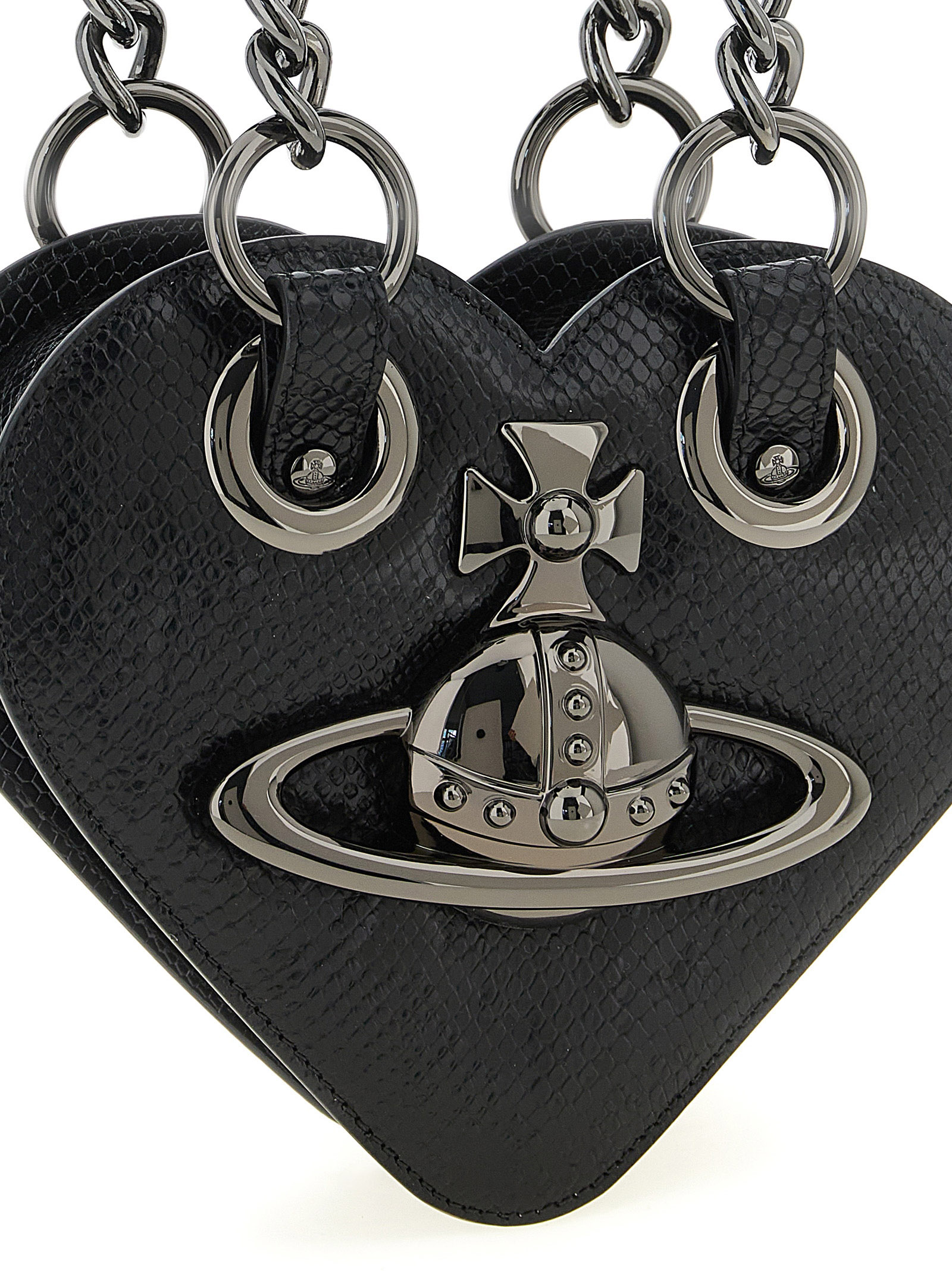 Juliet Heart Chain' shoulder bag in python-effect embossed leather with details and three-dimensional front Orb logo in polished metal, heart-shaped design, double chain handle with fixed leather protection, top zip closure.