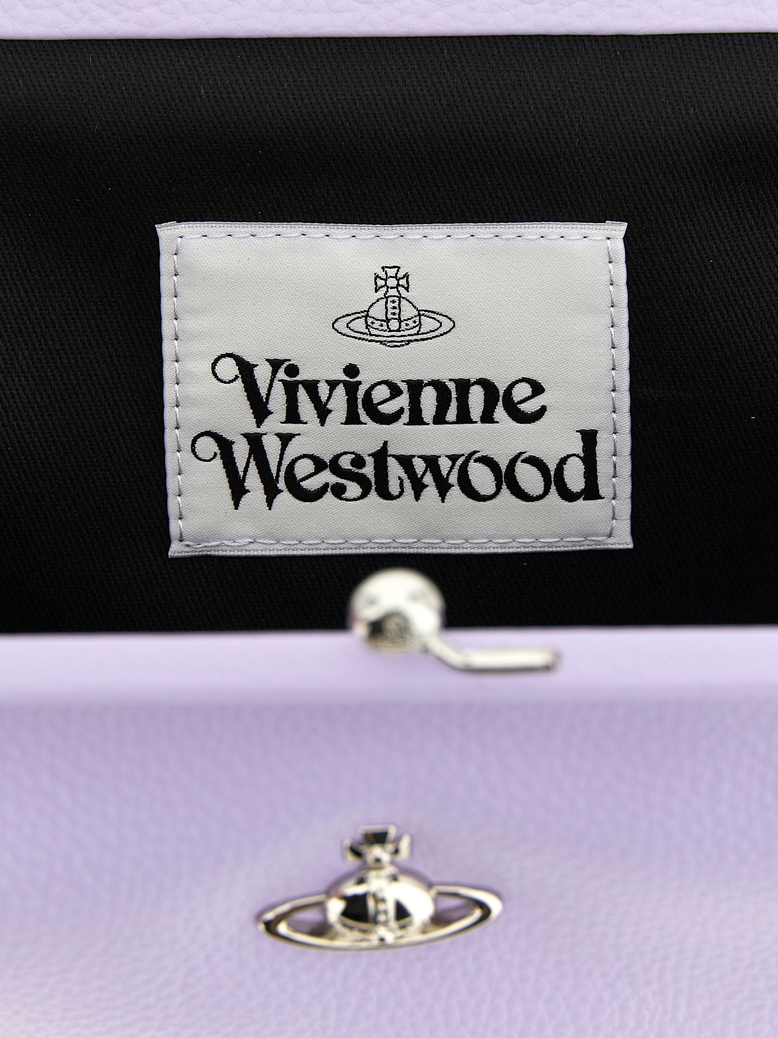 Vivienne clutch in hammered leather-effect fabric, front metal 'Orb Bas Relief' logo, snap closure, removable handle.
