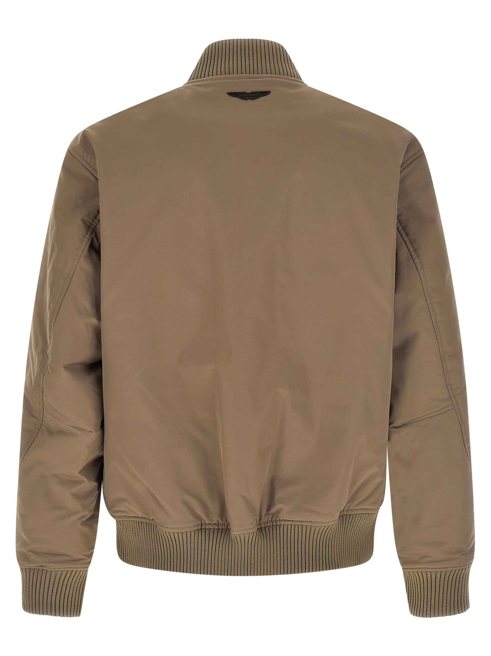 BOSS x Aston Martin 'Cantin' compact twill bomber jacket with water-repellent protective coating and tonal ribbed stretch knit details, lining, back metal logo, high neck, front zip closure, pockets, long sleeves with cuffs and dropped shoulders, and headband.