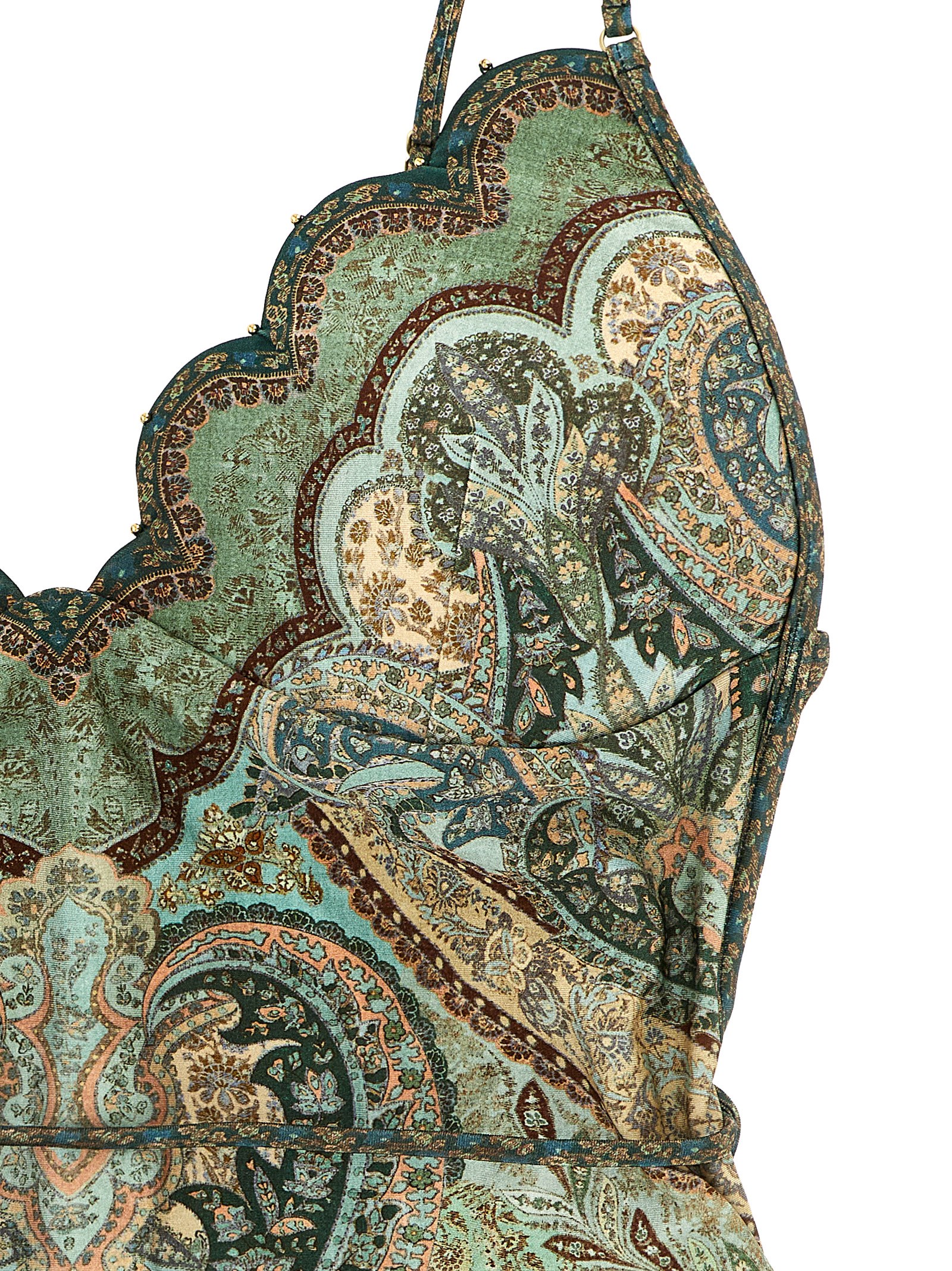 'Wanderlust' one-piece swimsuit in 'Tapestry multi' print technical fabric, scalloped V-neck with metal studs, thin adjustable straps, back hook closure, bare back, medium coverage briefs, rouleau belt with tassels at the ends.