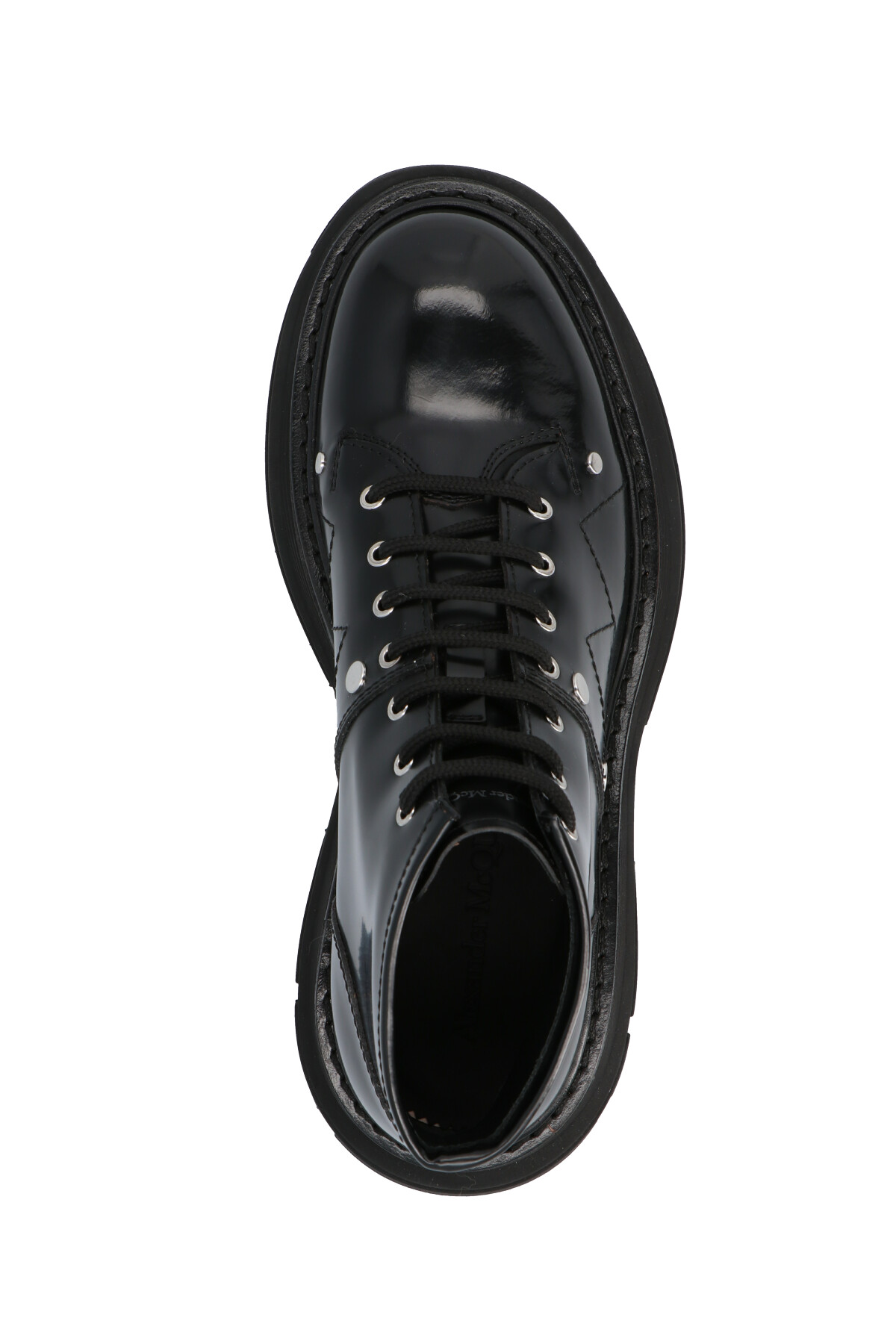 Alexander McQueen leather ankle boots featuring contrasting stitching and an oversize rubber sole, and laces.