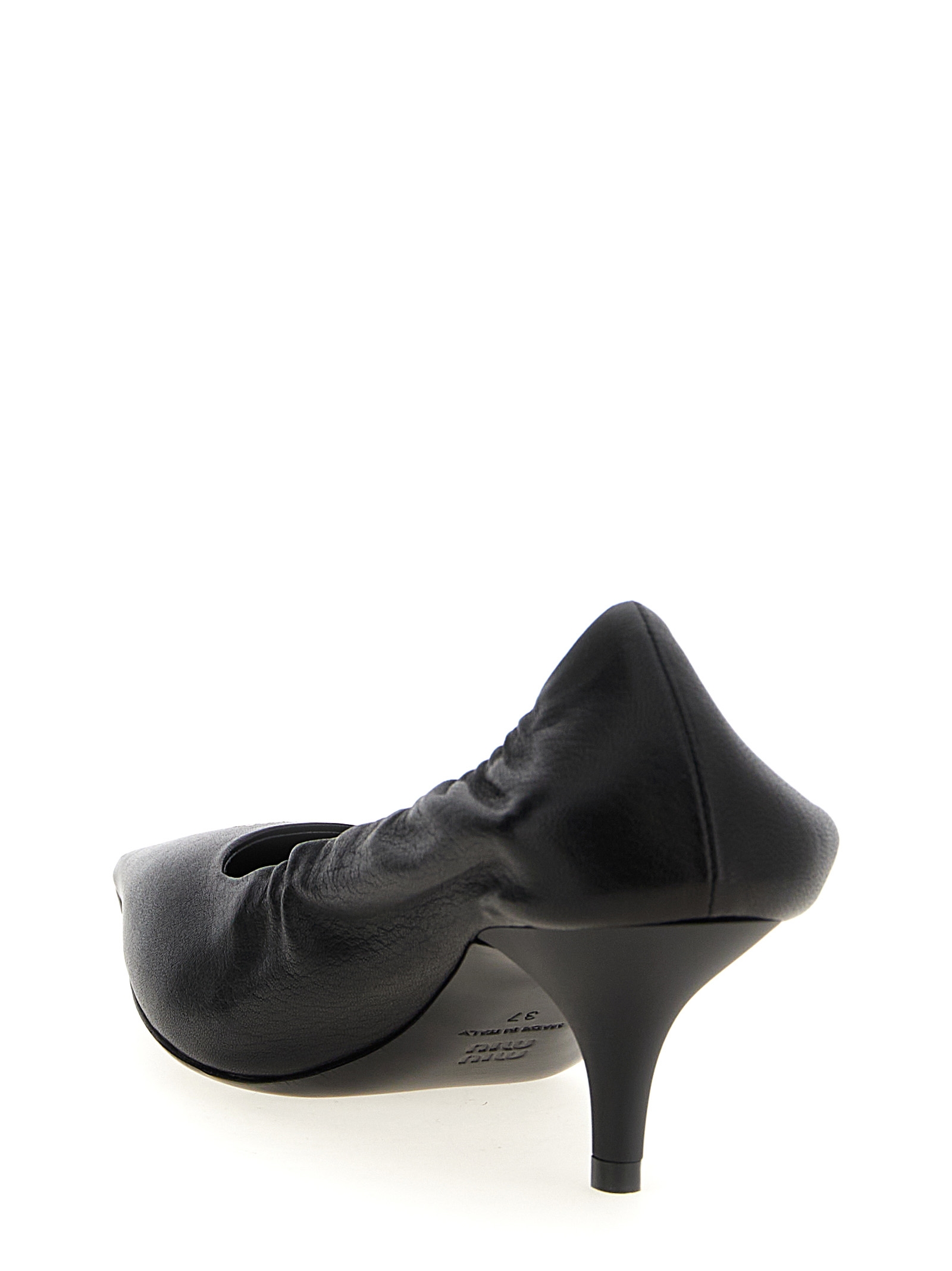 Nappa décolleté, square toe with front logo, elastic back, heel, leather sole.