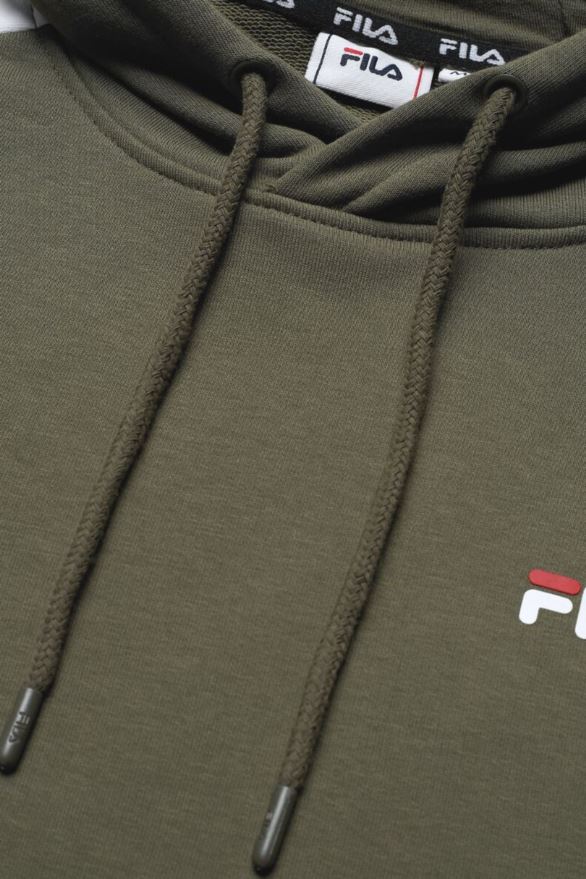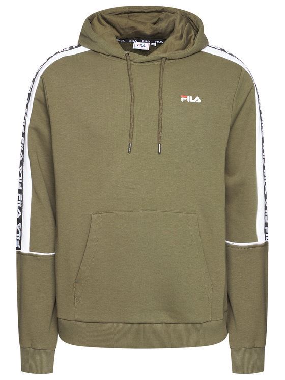 Bluza z kapturem Fila w kolorze zielonym. Na rękawach czarno-białe paski z logiem Fila. Kieszeń typu kangurka na dole