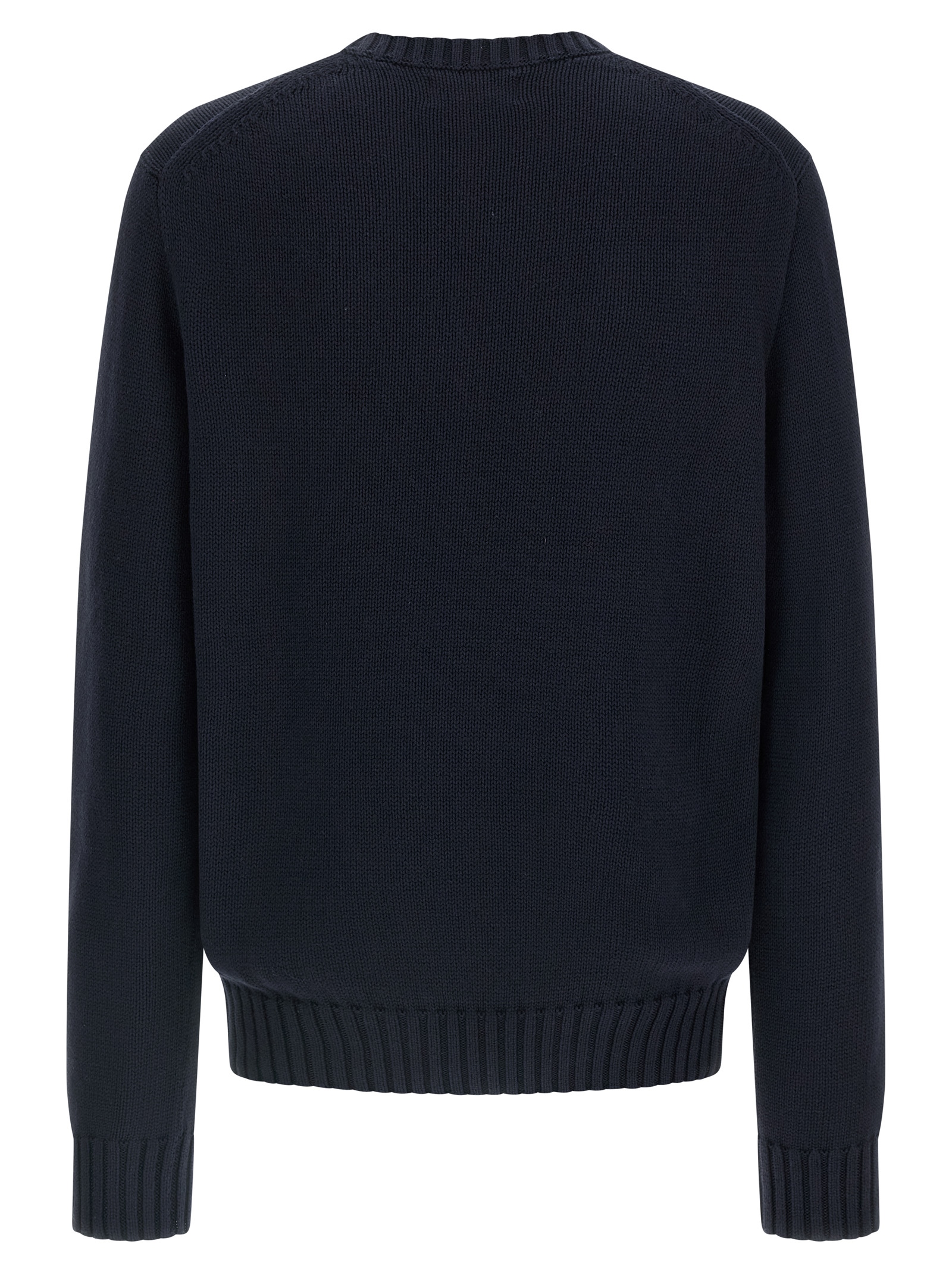 Cotton knit sweater with intarsia and front embroidery, crew neck, long cuffed sleeves.