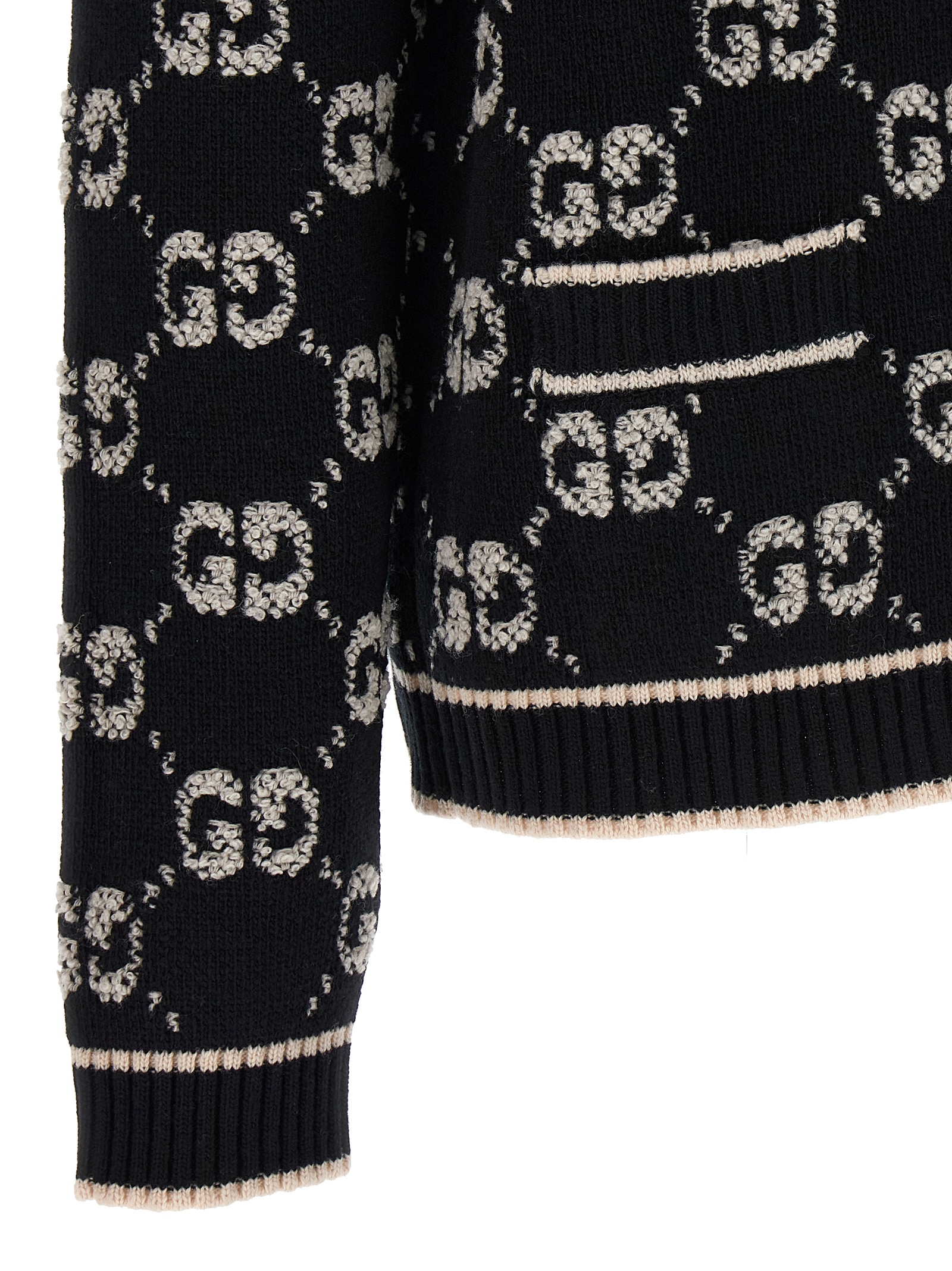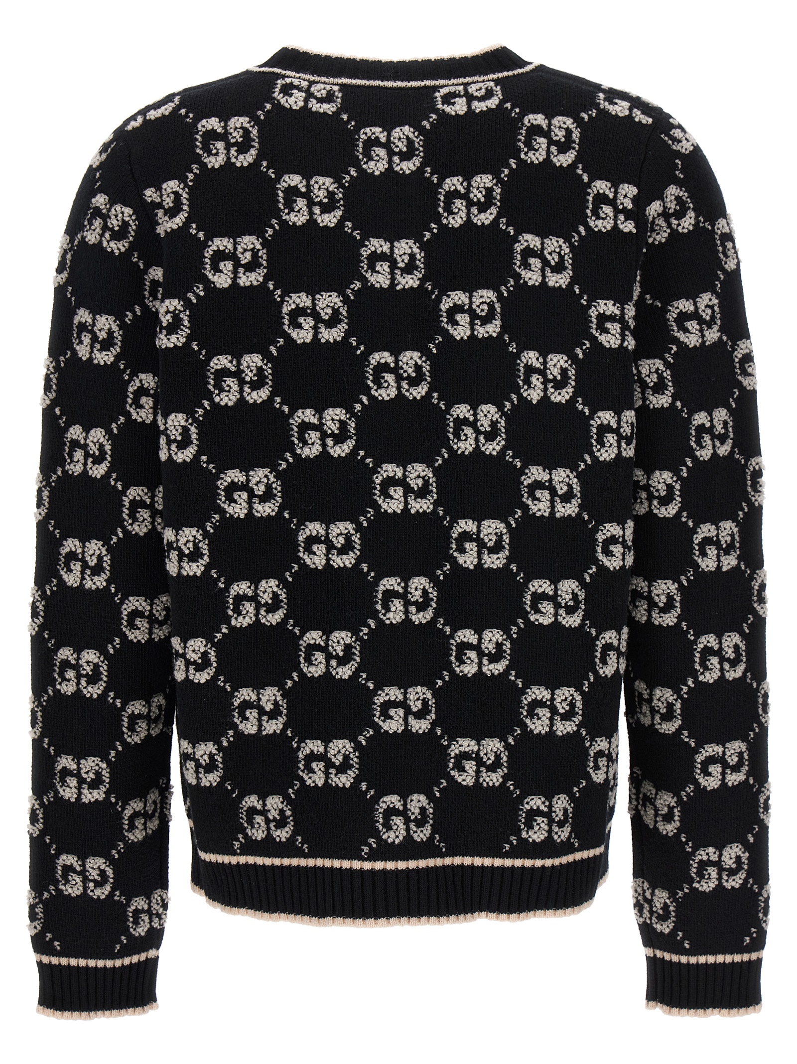 Wool cardigan with all-over GG jacquard logo, crew neck, button closure.