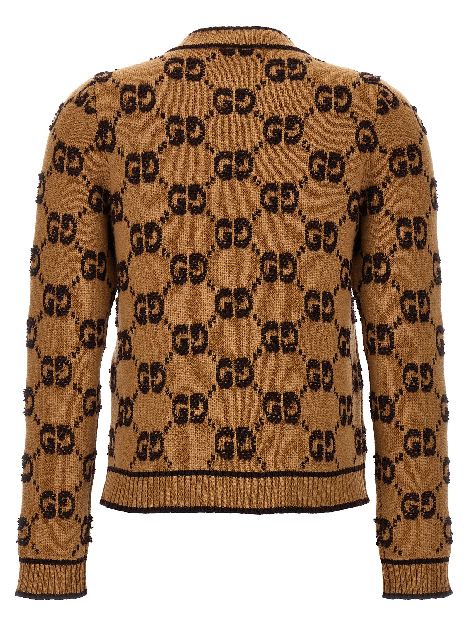 Bouclè tweed wool cardigan with all-over GG logo, crewneck model with gold button closure.