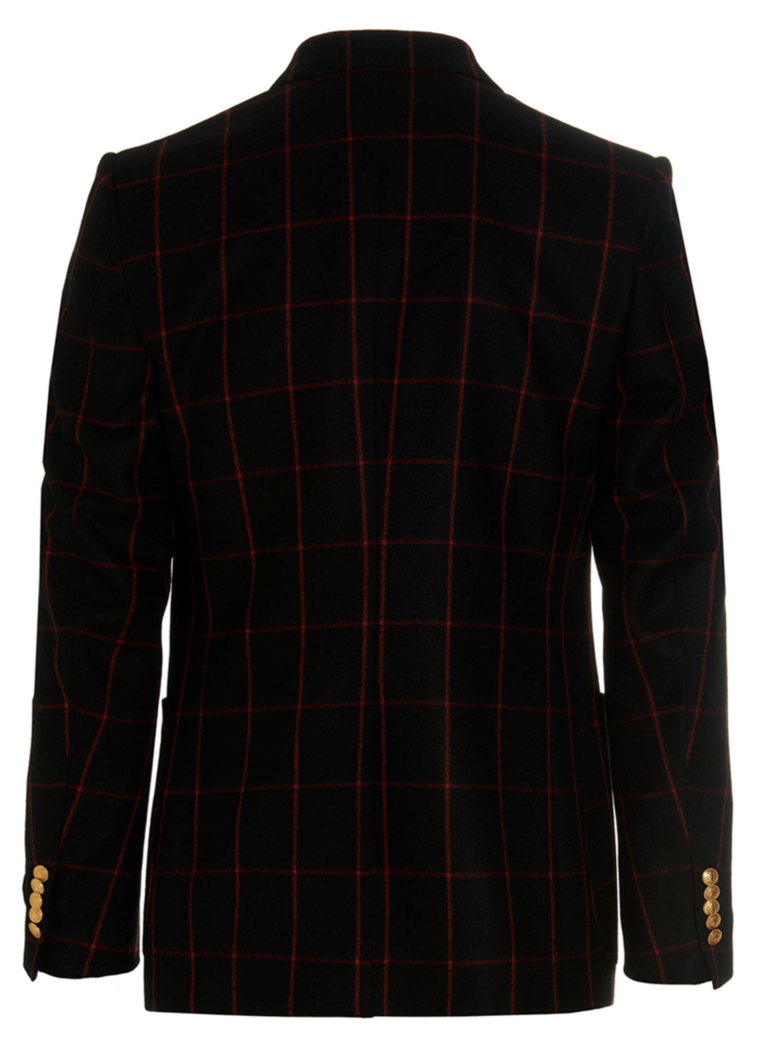 Double-breasted black and red check blazer in wool with Gucci web tape on the sleeve, button closure with gold rider, three front pockets, peak lapels, back vent. a back split.