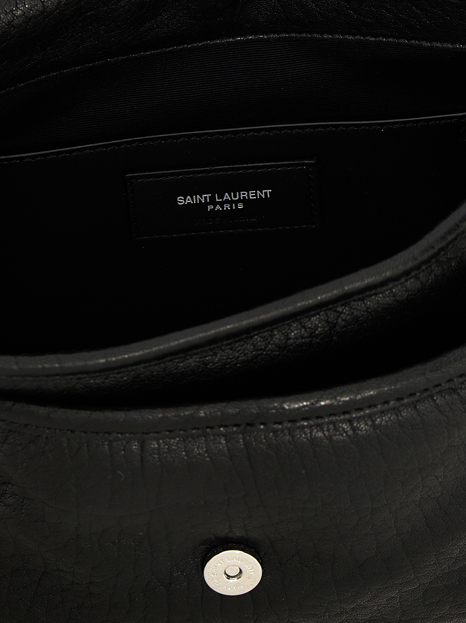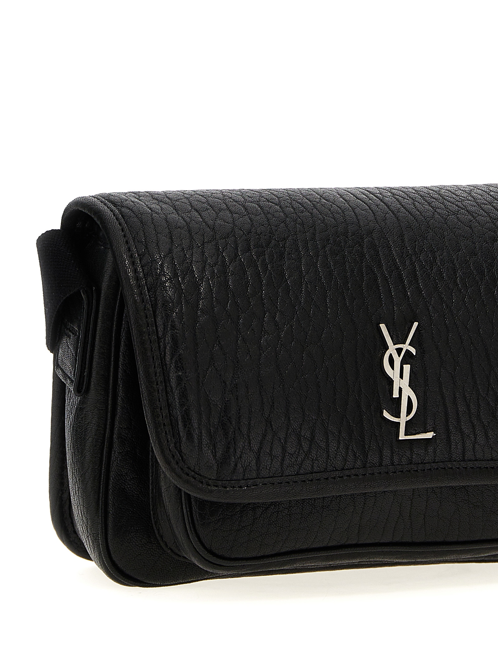 'Messenger Small Niki' hammered leather crossbody bag, magnetic flap closure, metal logo detail, adjustable shoulder strap.