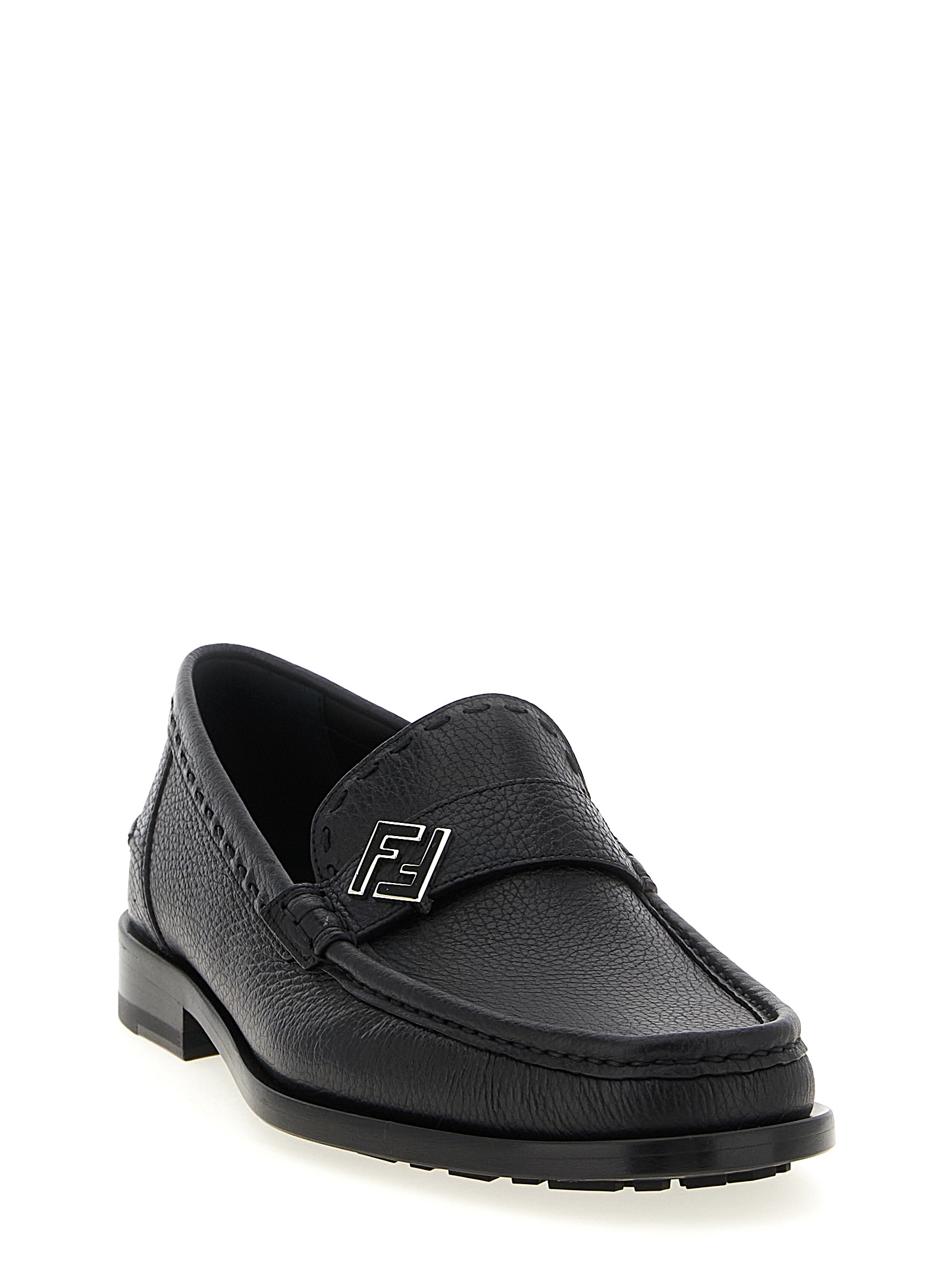 'FF Metal' botched calf leather loafers with metal 'FF' detail on the front, rubber sole with embossed FF pattern.