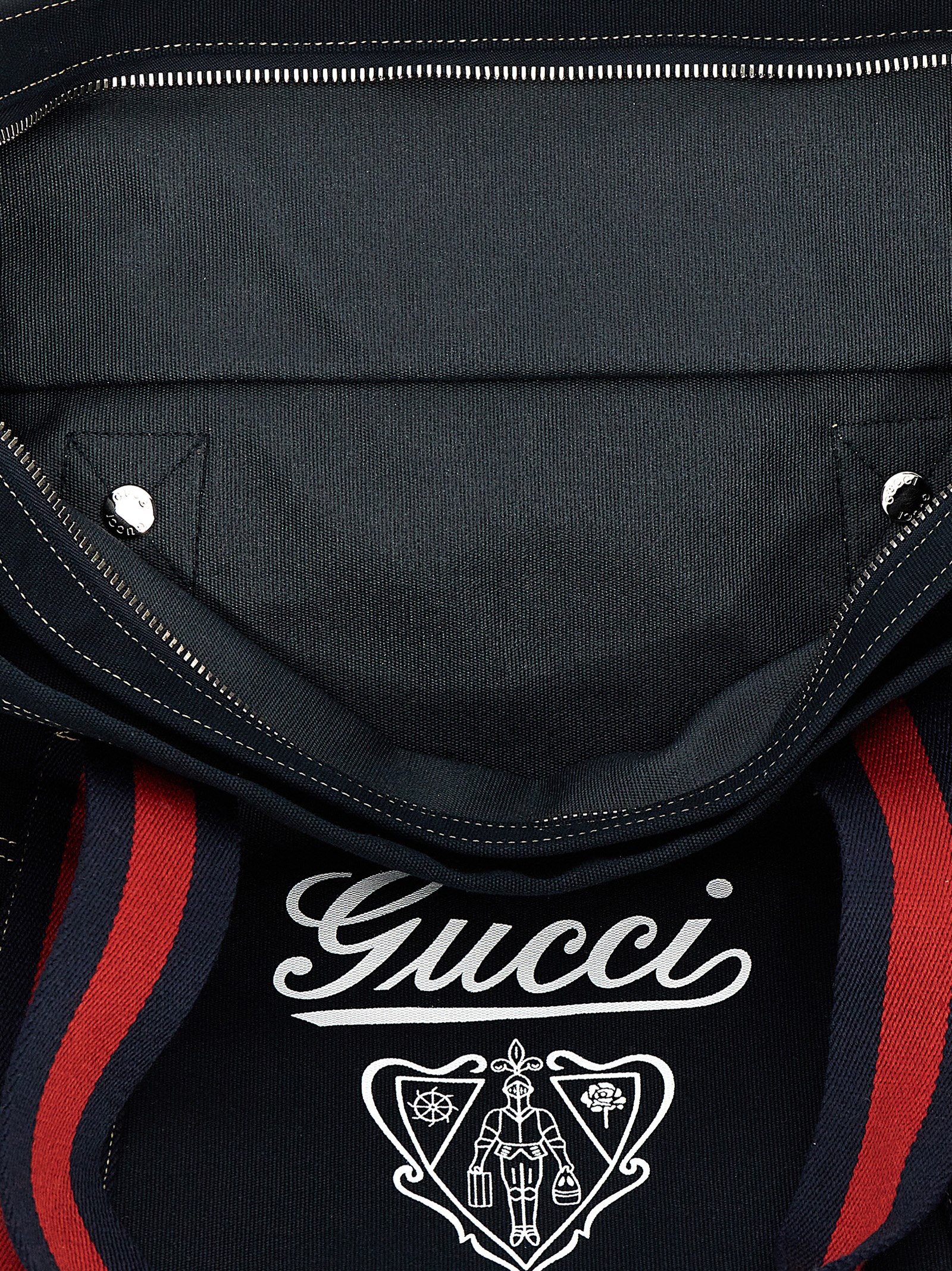 Large cotton shopping bag with leather details, contrast front coat of arms print, double fixed handle in Nastro Web fabric, top zip closure, pockets.